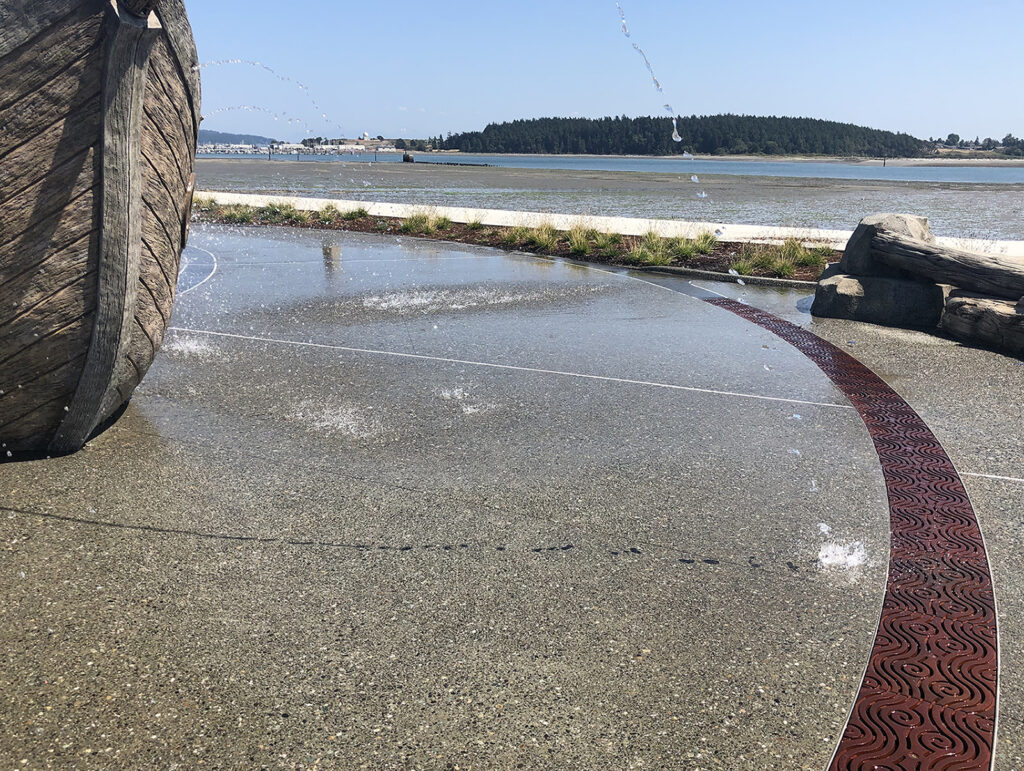 Argo 12″ wide heel-proof radiused trench grate, raw cast iron. DESIGN: GreenWorks. INSTALLER: Interwest. PROJECT: Windjammer Park. LOCATION: Oak Harbor, WA.