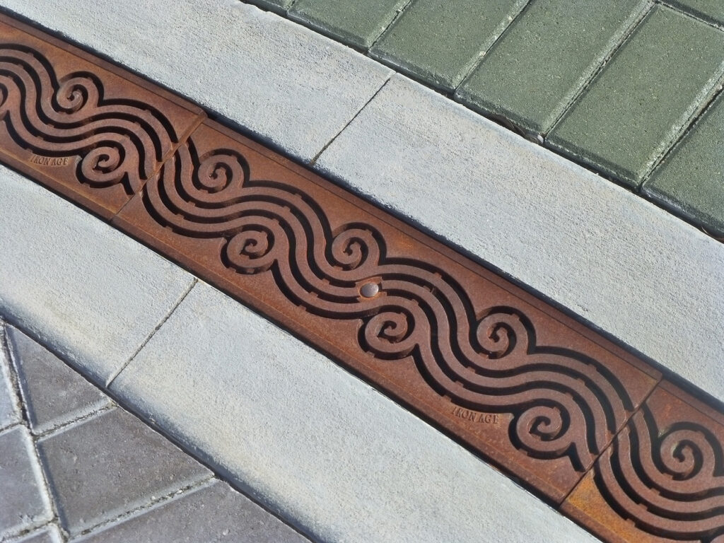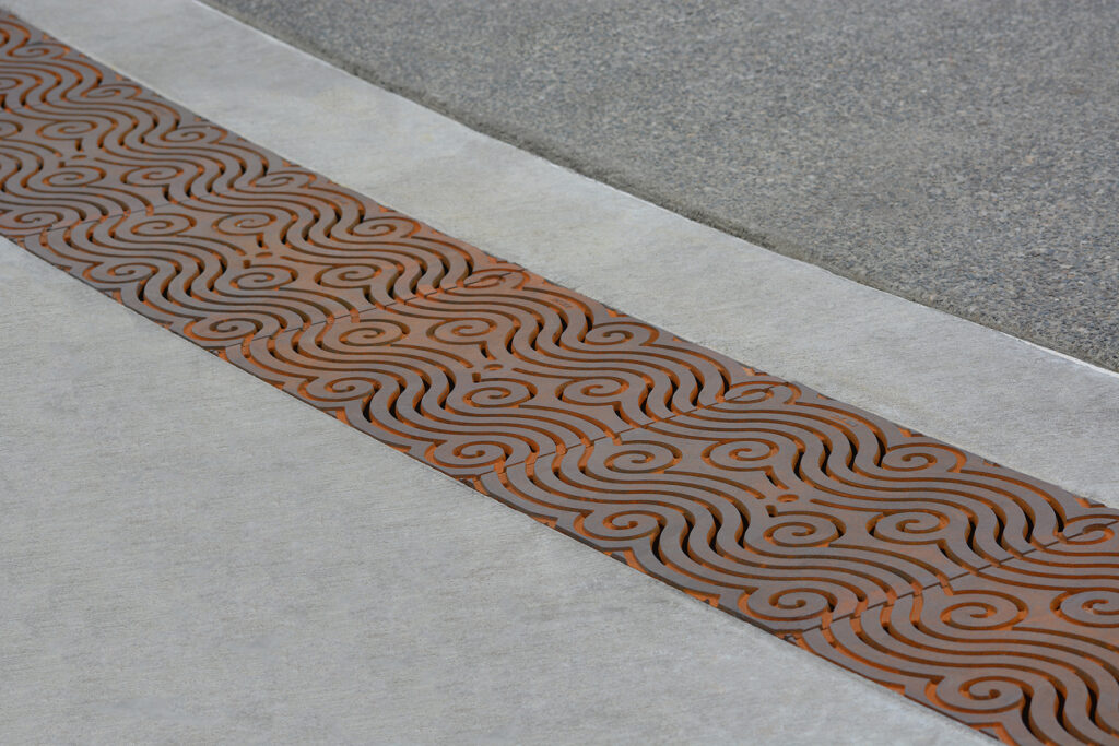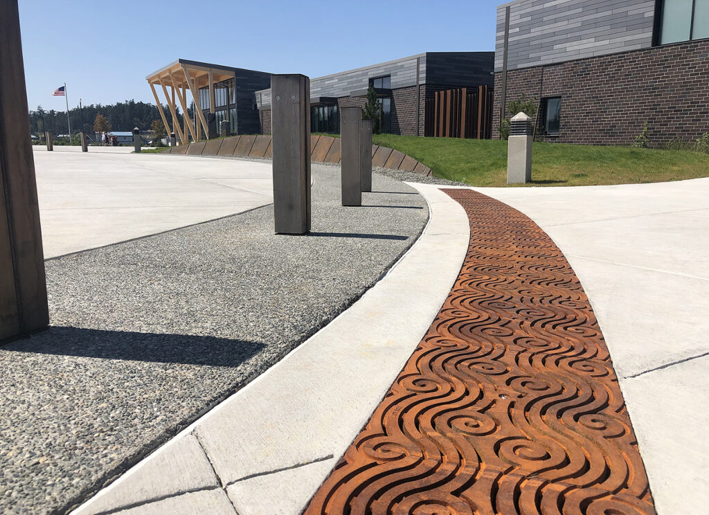 Argo 15″ wide heel-proof radiused trench grate, raw cast iron. DESIGN: GreenWorks. INSTALLER: Interwest. PROJECT: Windjammer Park. LOCATION: Oak Harbor, WA.