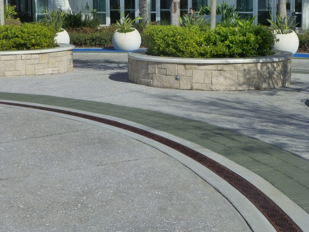 Argo 5.5″ wide heel-proof radiused trench grate, cast ductile iron with baked-on-oil finish. DESIGN: ITEC Entertainment. PROJECT: Hilton Event Lawn. LOCATION: Orlando, FL.