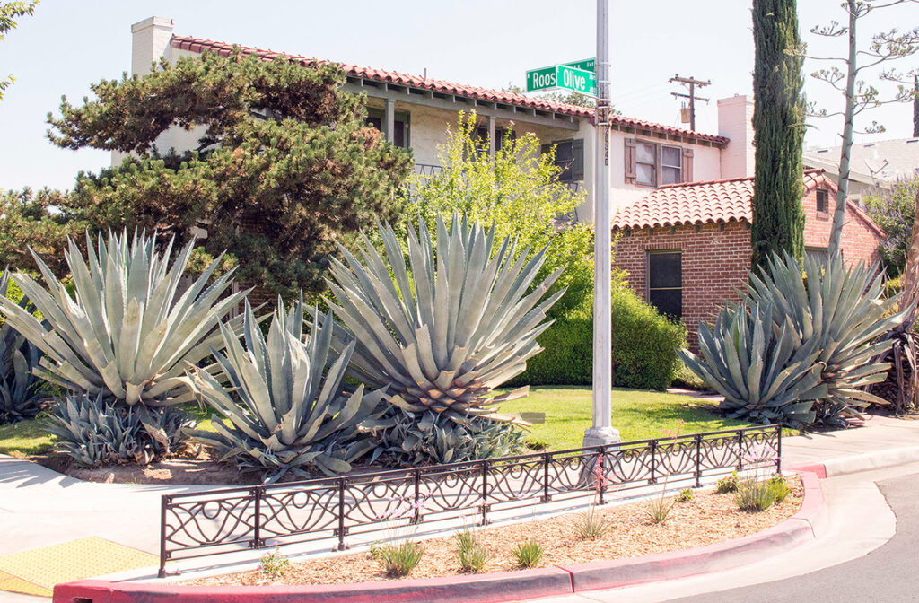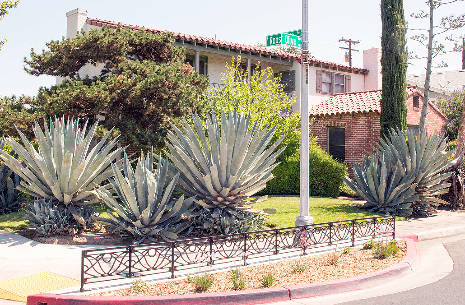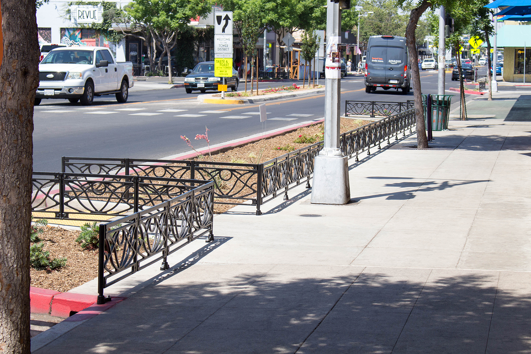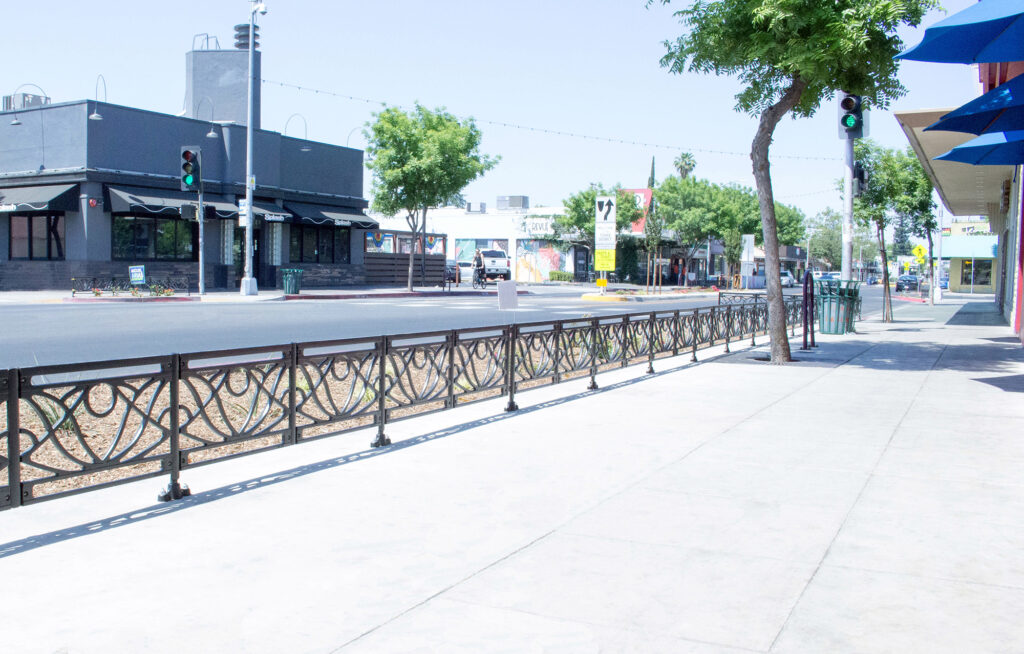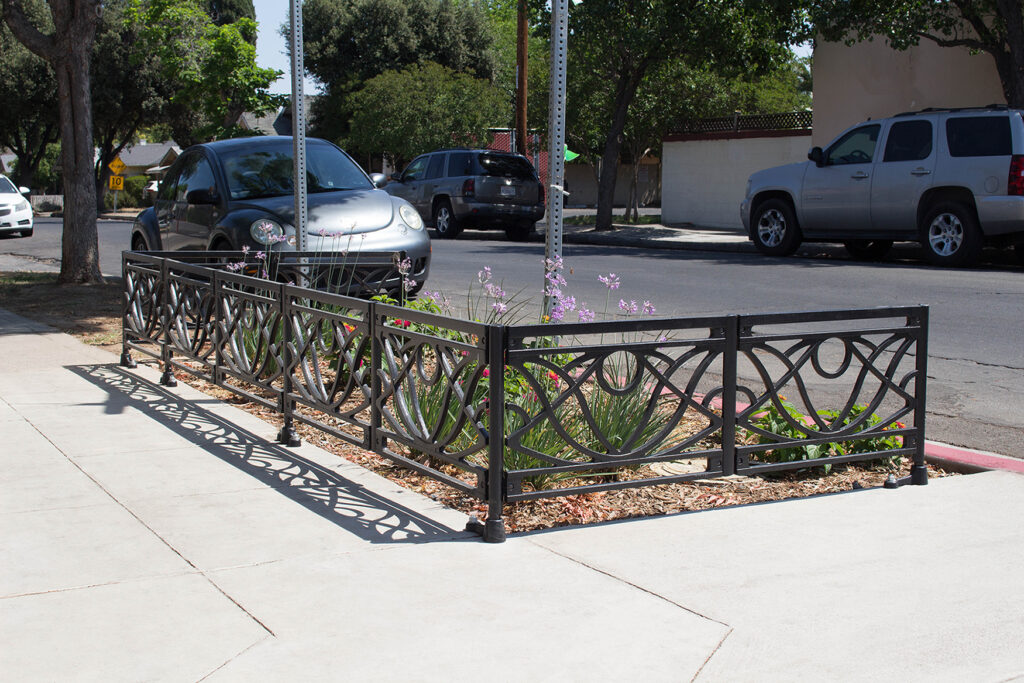 Belle planter fence, cast ductile iron, black powder coat finish. DESIGN: GSM Landscape Architects, Inc. INSTALLER: A.J. Excavation. PROJECT: Olive Avenue Streetscape. LOCATION: Fresno, CA.