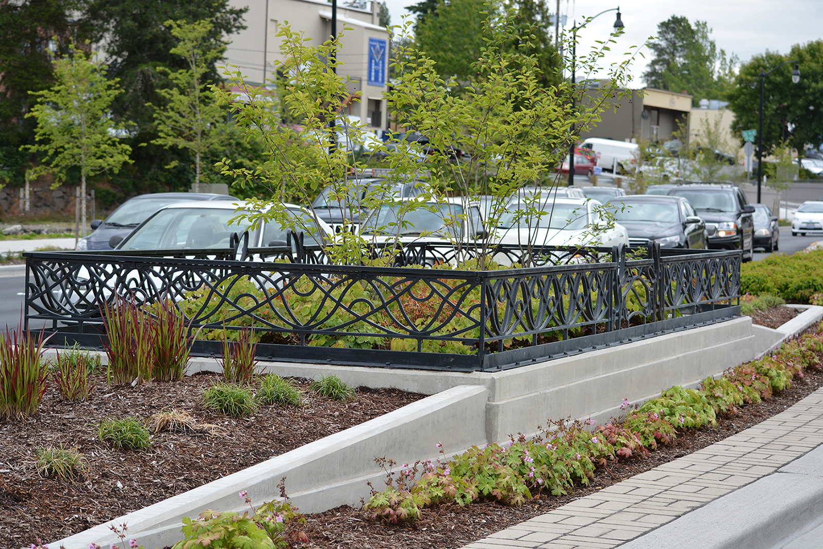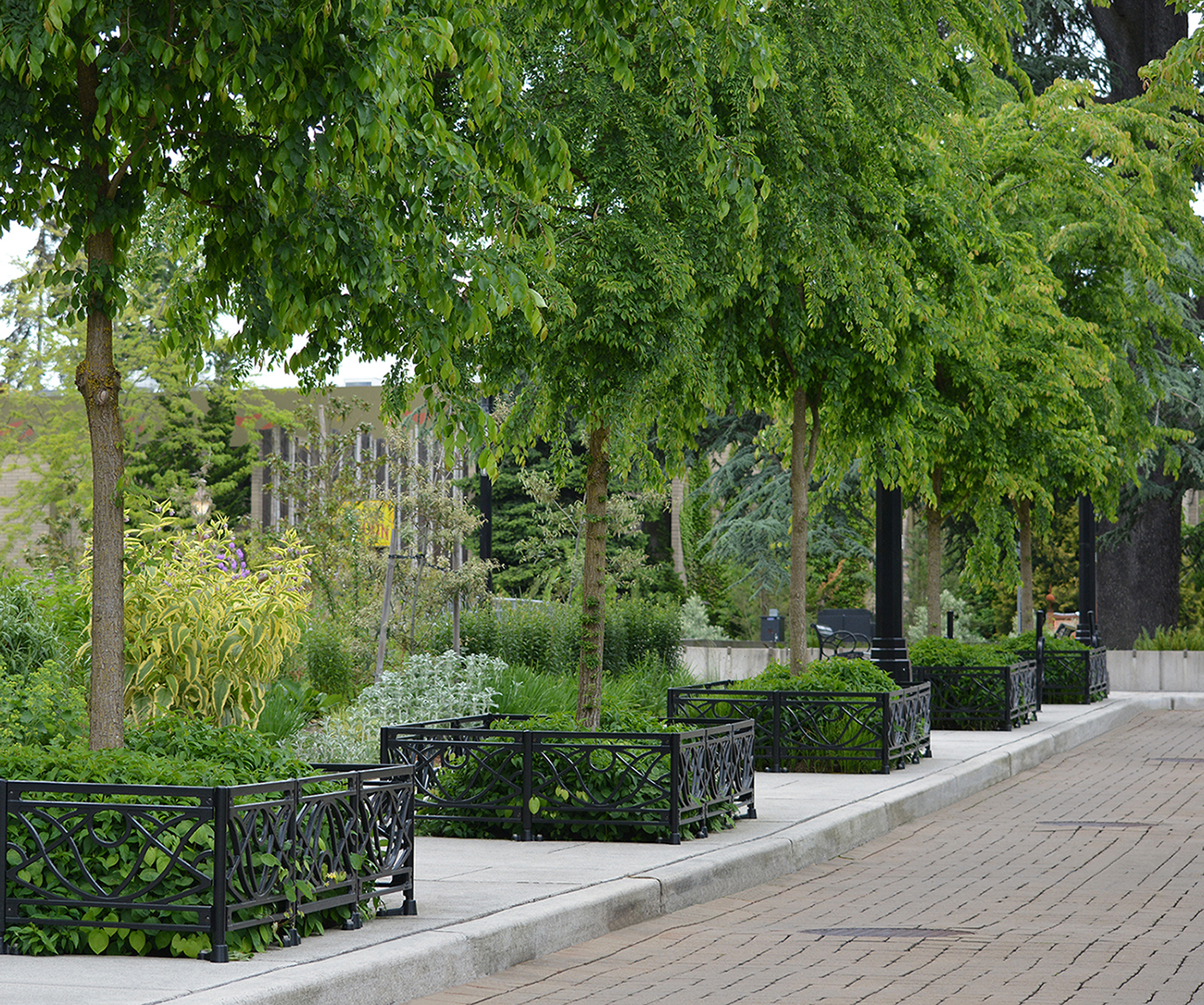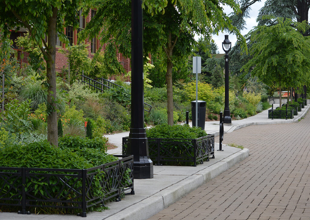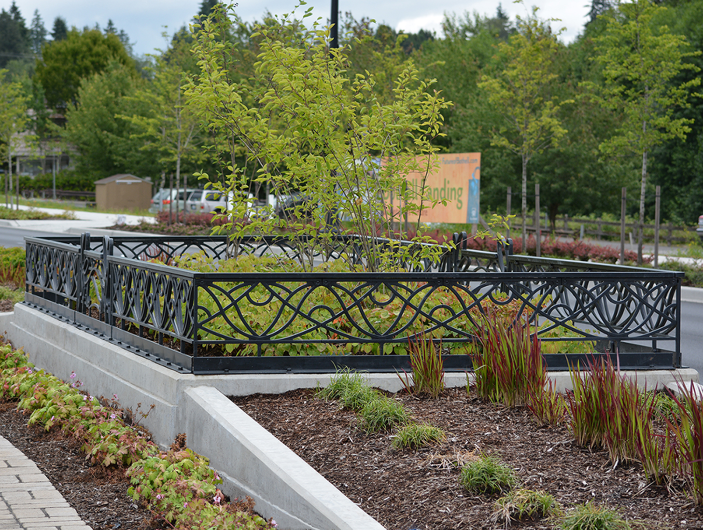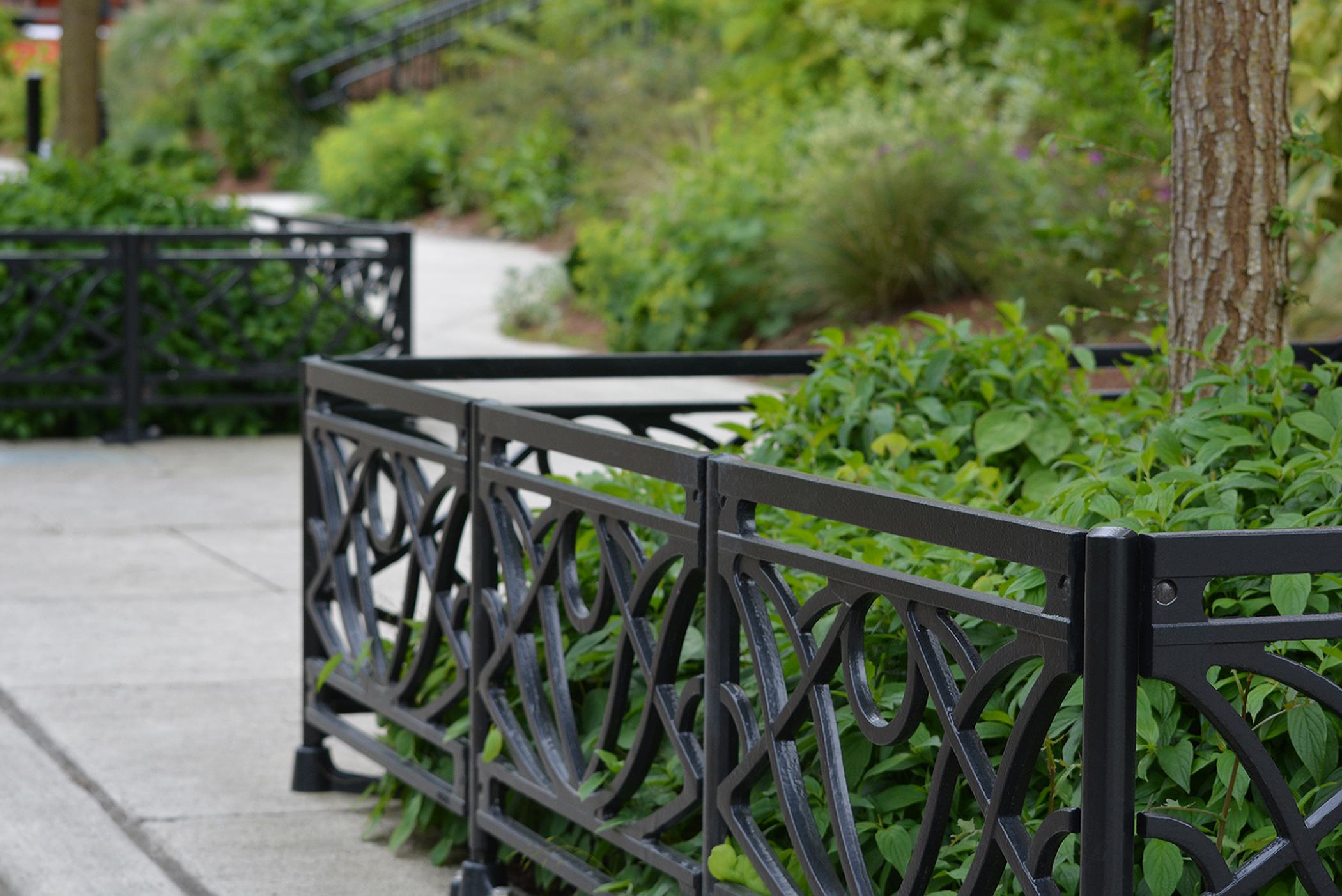 Belle planter fence, cast ductile iron, black powder coat finish. DESIGN: HBB Landscape Architecture. PROJECT: Bothell SR-527 Multi-way Boulevard. LOCATION: Bothell, WA.