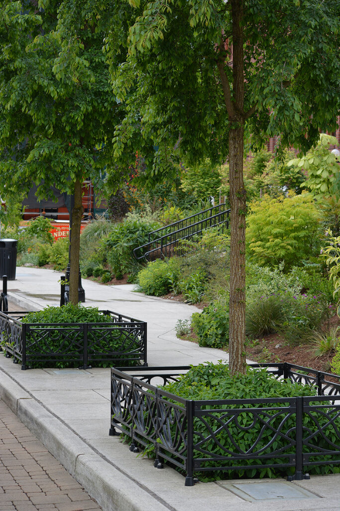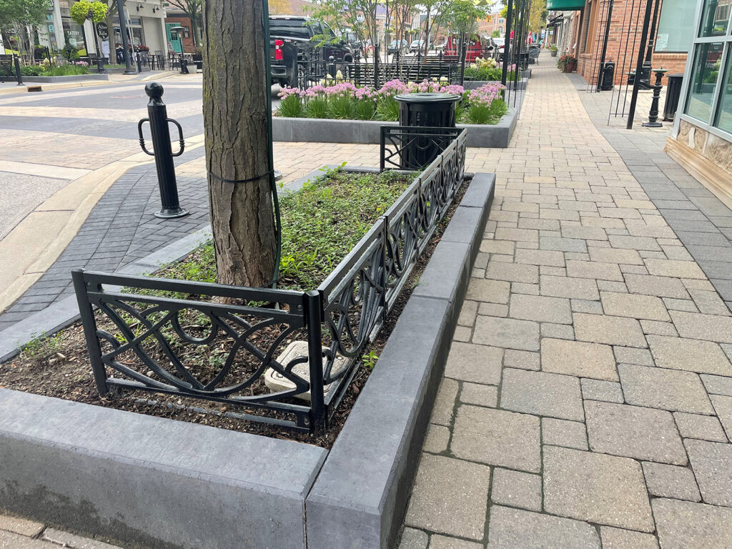 Belle planter fence, cast ductile iron, black powder coat finish. DESIGN: Grissim Metz Andriese Associates. PROJECT: Village of Milford – Main Street Downtown Streetscape. LOCATION: Milford, MI.
