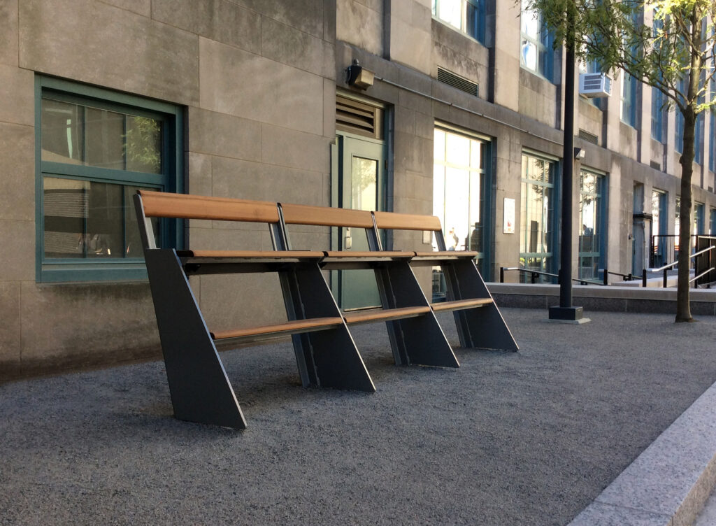 Custom water jet cut steel bench with Ipe seat, back, and foot rest. PROJECT: BU Law School. LOCATION: Boston, MA.