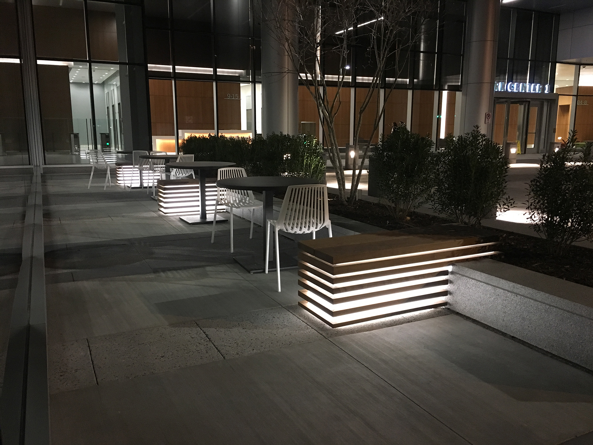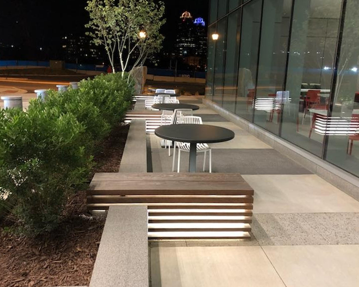 Custom 54″ lighted bench, steel frame with Ipe and 3Form™ exterior. DESIGN: Cooper Carry. PROJECT: State Farm Park Center. LOCATION: Dunwoody, GA.