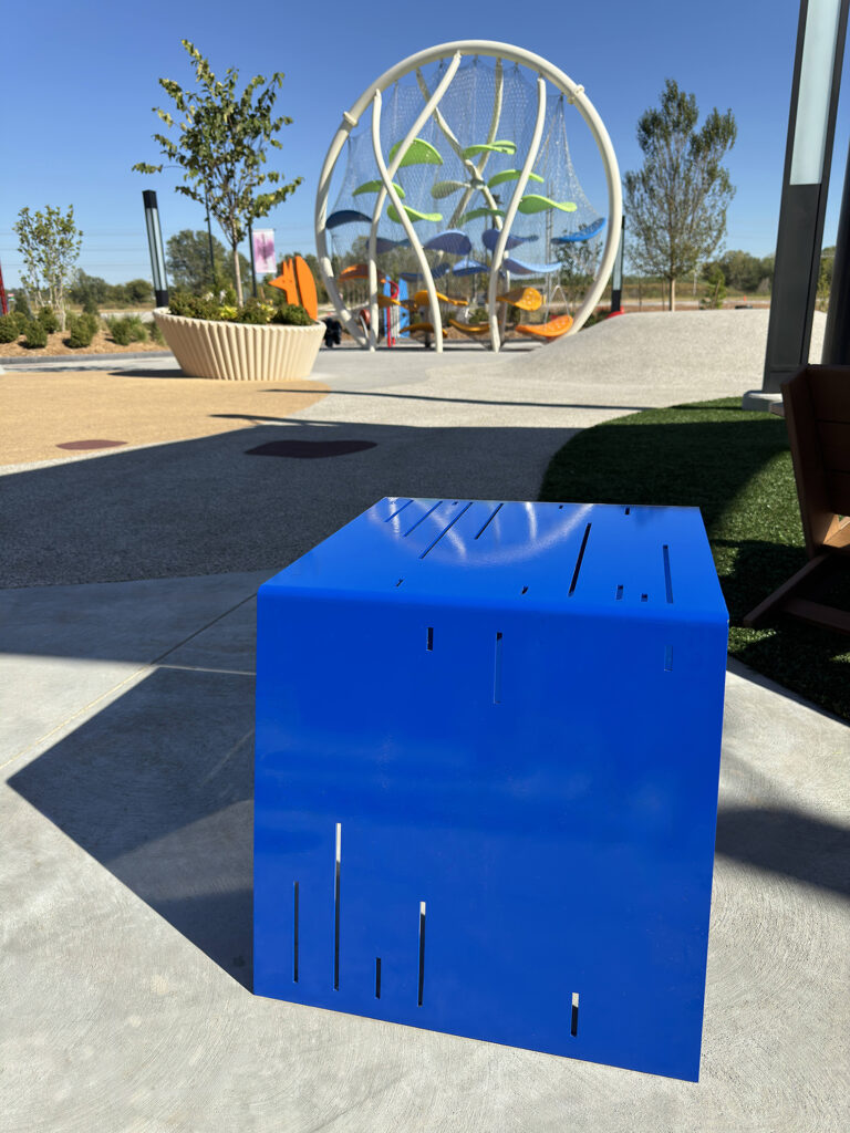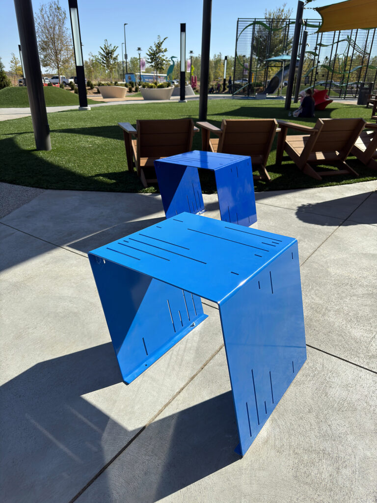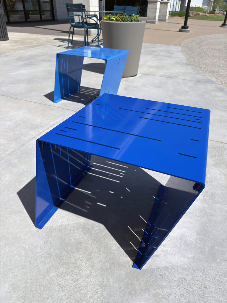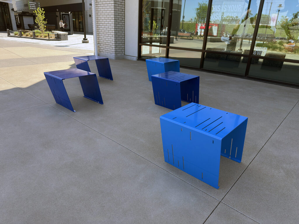 Formato Lines seating, laser cut steel with powder coat finish. DESIGN: Kimley-Horn. PROJECT: Tulsa Premium Outlets. LOCATION: Tulsa, OK.