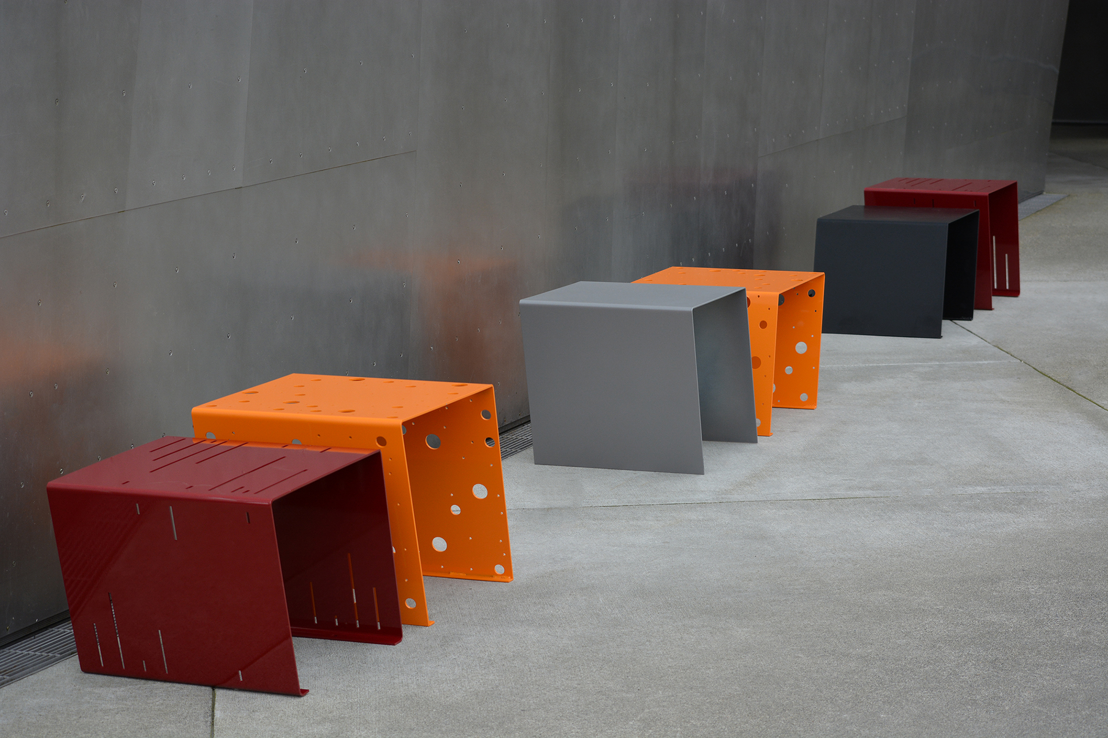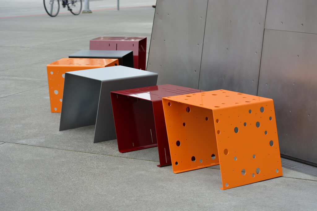 Formato Bubble, Lines, and Solid seating, laser cut steel with powder coat finish.