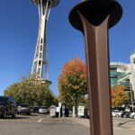 Tak Round bollard, cast aluminum with powder coat finish. DESIGN: Foreseer. PROJECT: Assembly Row. LOCATION: Somerville, MA.