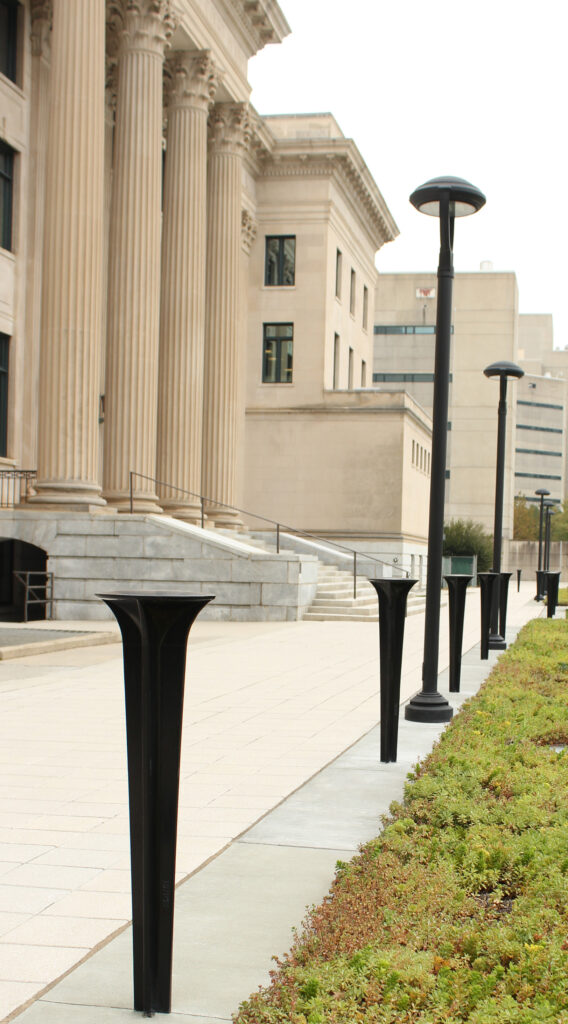 Tak Round bollard, cast aluminum with powder coat finish. DESIGN: Bloc Design. PROJECT: Mecklenburg County District Attorney Building. LOCATION: Charlotte, NC.