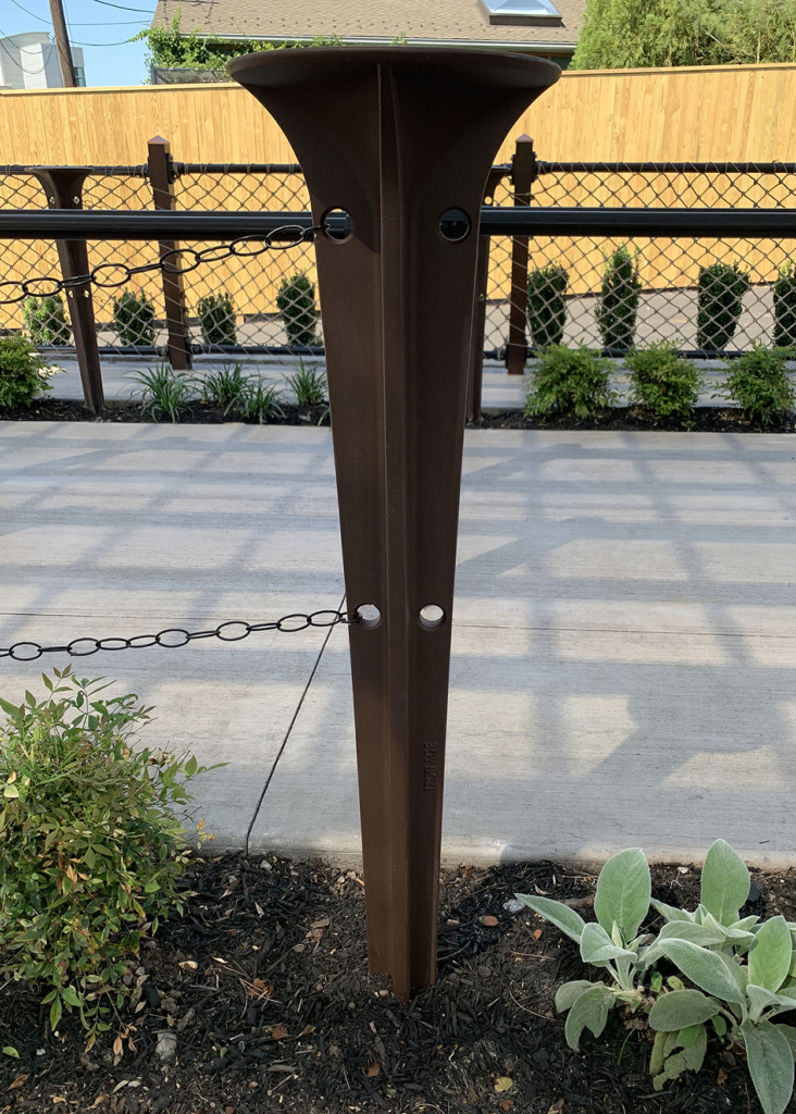 Tak Round bollard, cast aluminum with “Special Rust Texture” powder coat finish. Customized with holes drilled and chains attached for line management at the entrance to Turtle Back Zoo Train Station. DESIGN: French & Parello Associates. LOCATION: Orange, NJ.