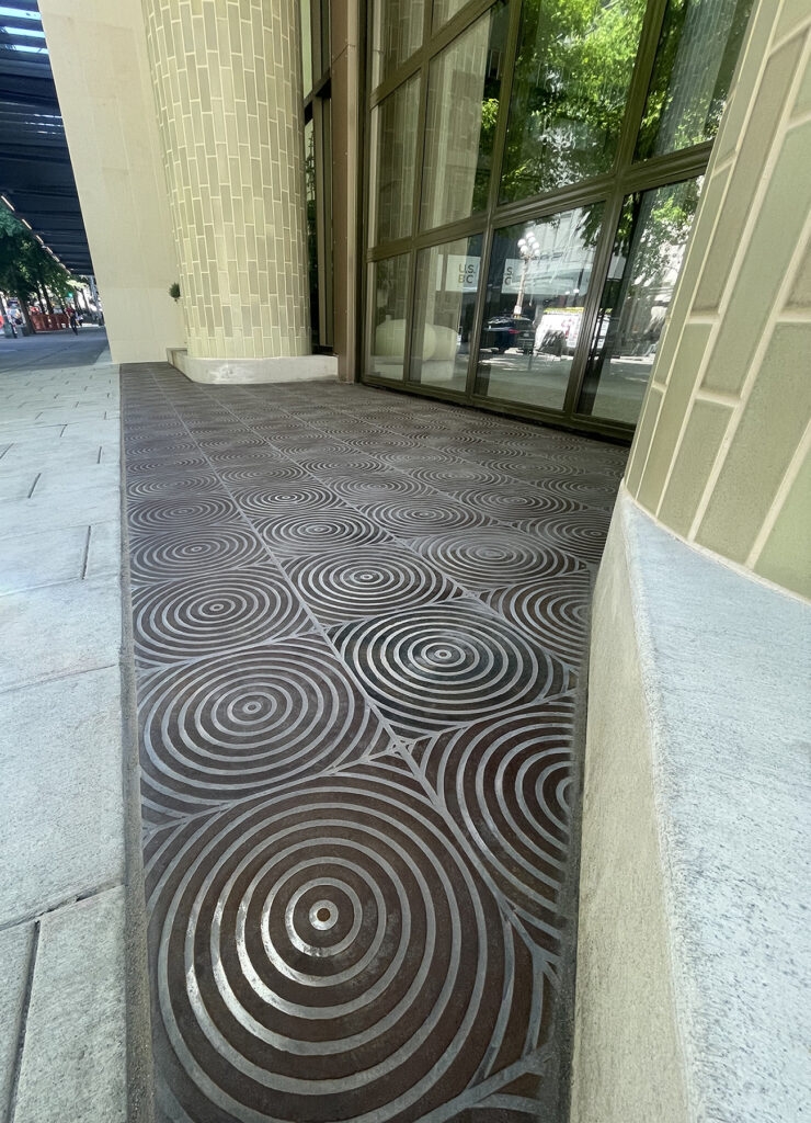 Bullseye 12″ x 12″ heel-proof catch basin grates, cast ductile iron with baked-on-oil finish, arrayed as an entry walk-off mat. DESIGN: SkB Architects. PROJECT: US Bank Center. LOCATION: Seattle, WA.