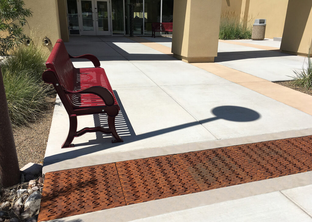 Janis 24″ Sq. catch basin grate (shown arrayed as trench grates). Project: Jefferson Middle School, Albuquerque, NM