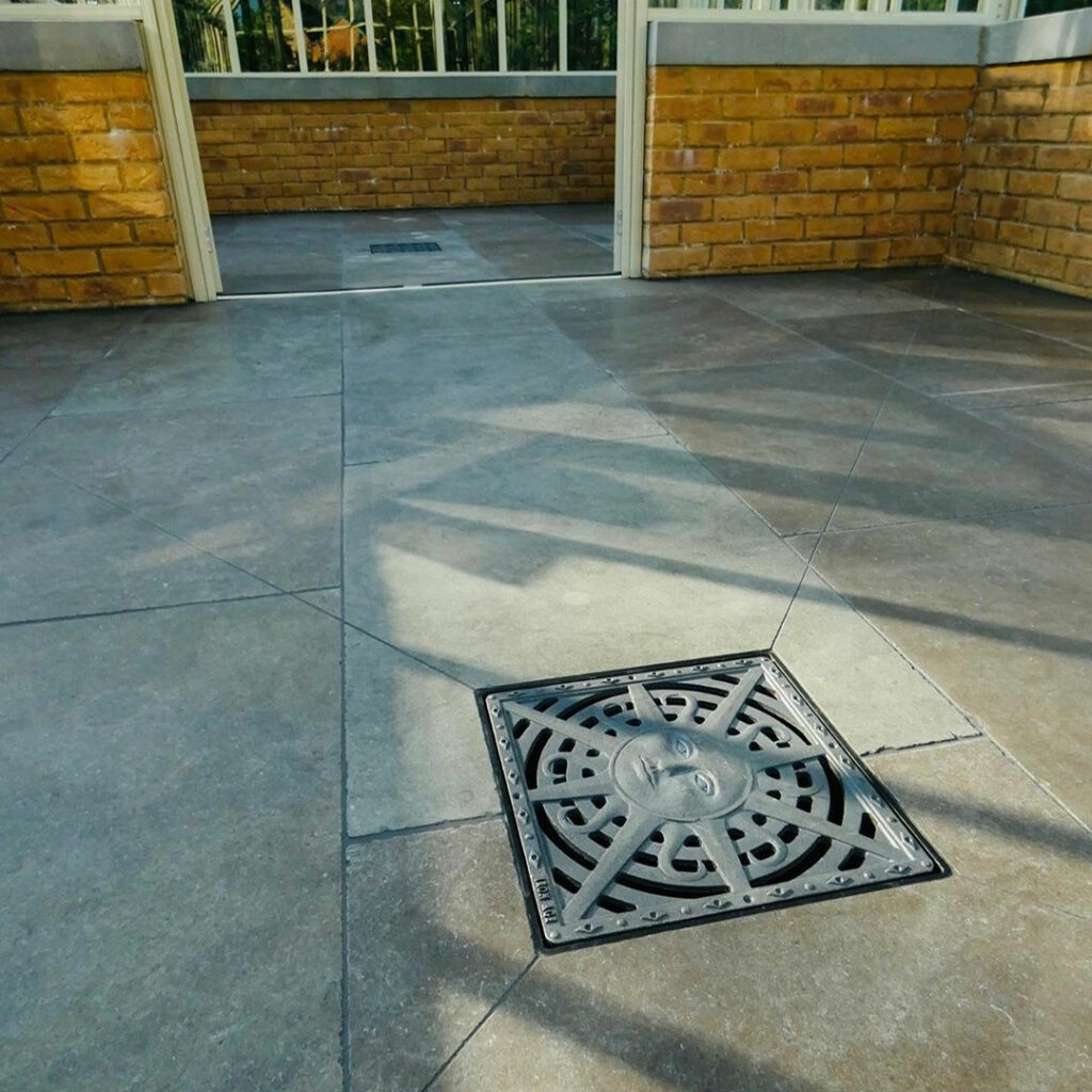 Sun 12″ Sq. catch basin grate, raw cast iron, pictured with the NDS catch basin box.