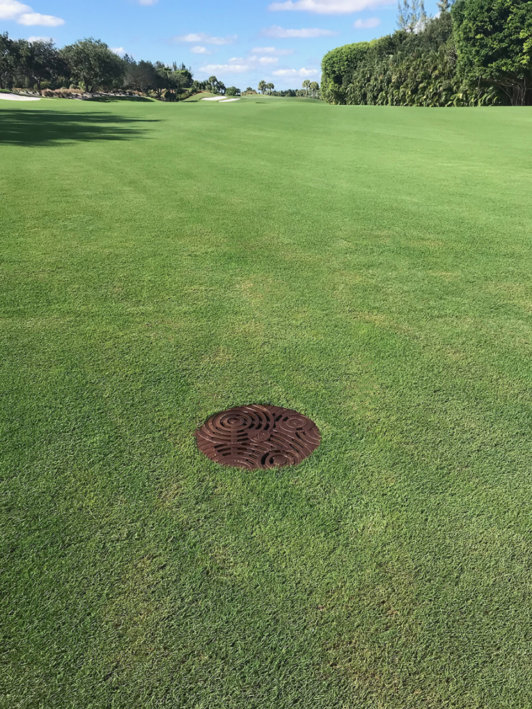 Custom Oblio 14″ dia. catch basin grate with logo, cast iron with baked-on-oil finish. PROJECT: Emerald Dunes Golf Club. LOCATION: West Palm Beach, FL.