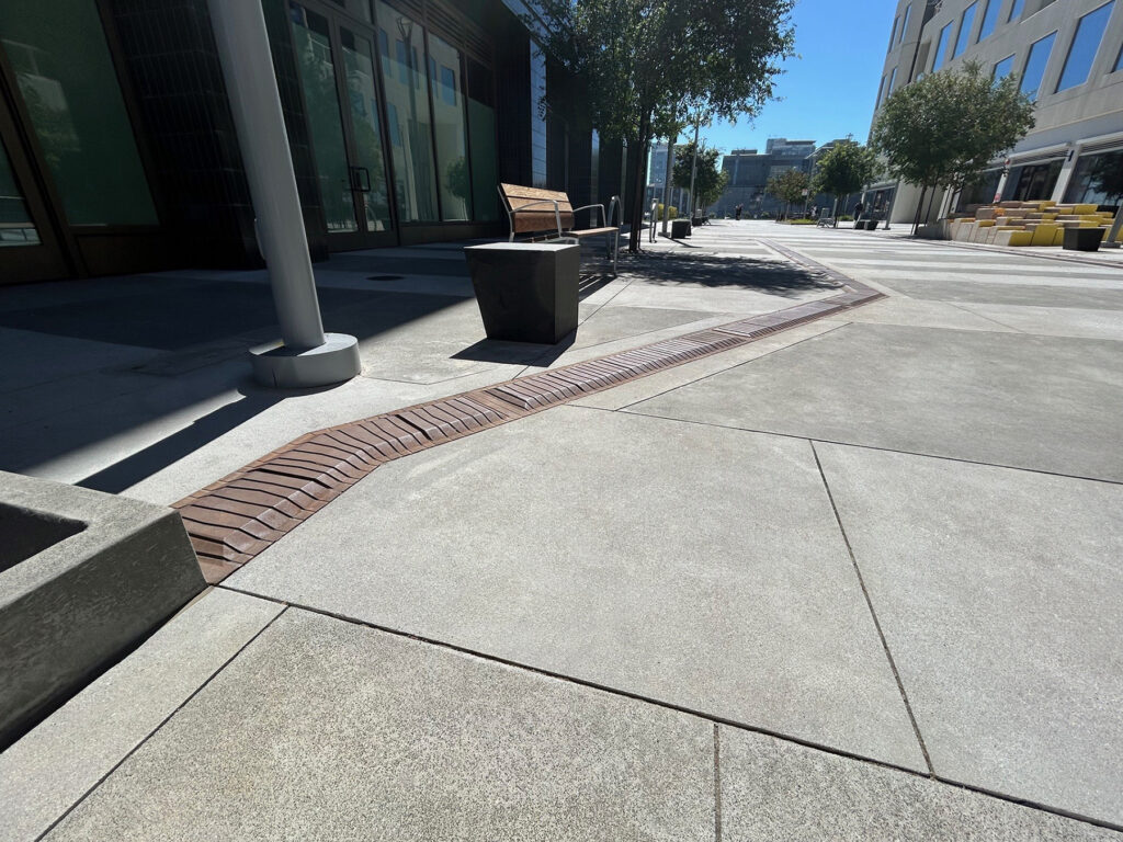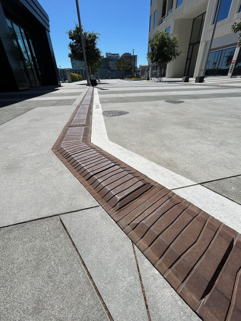 Custom DWP/wayfinding tile, cast iron with baked-on-oil finish. DESIGN: CMG Landscape Architecture. INSTALLATION: MF Maher Inc. PROJECT: Treasure Island. LOCATION: San Francisco, CA.