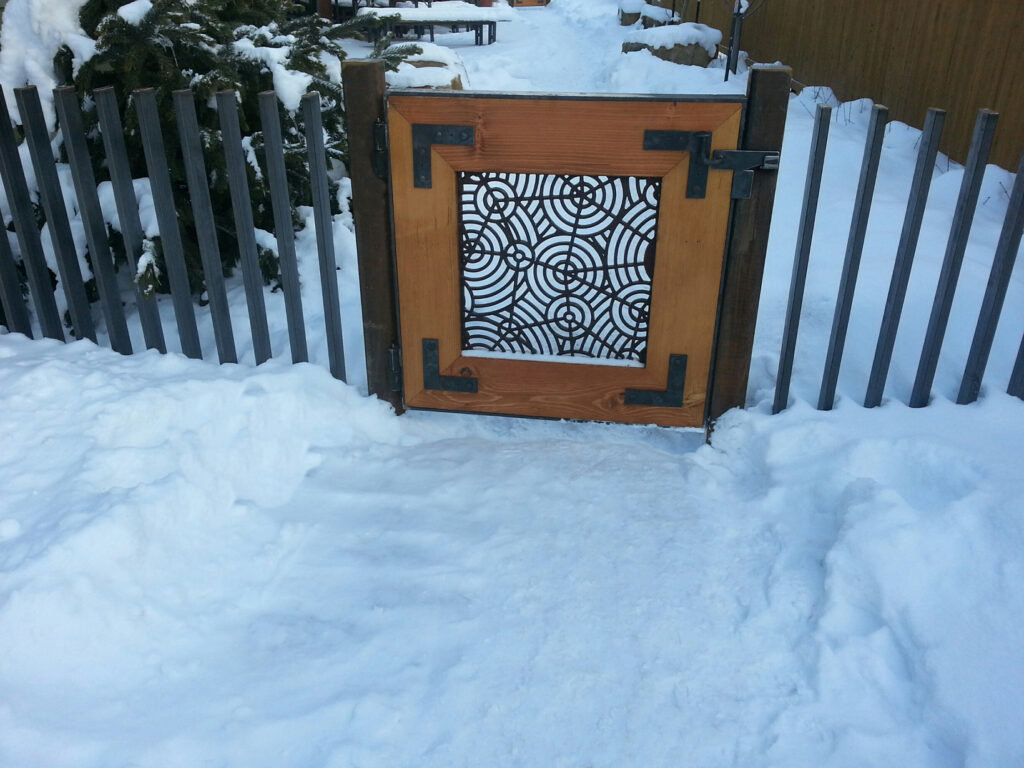 This is gate takes one of our 24″ Sq. Oblio vent grates, repurposed to create decorative window within its wood frame.