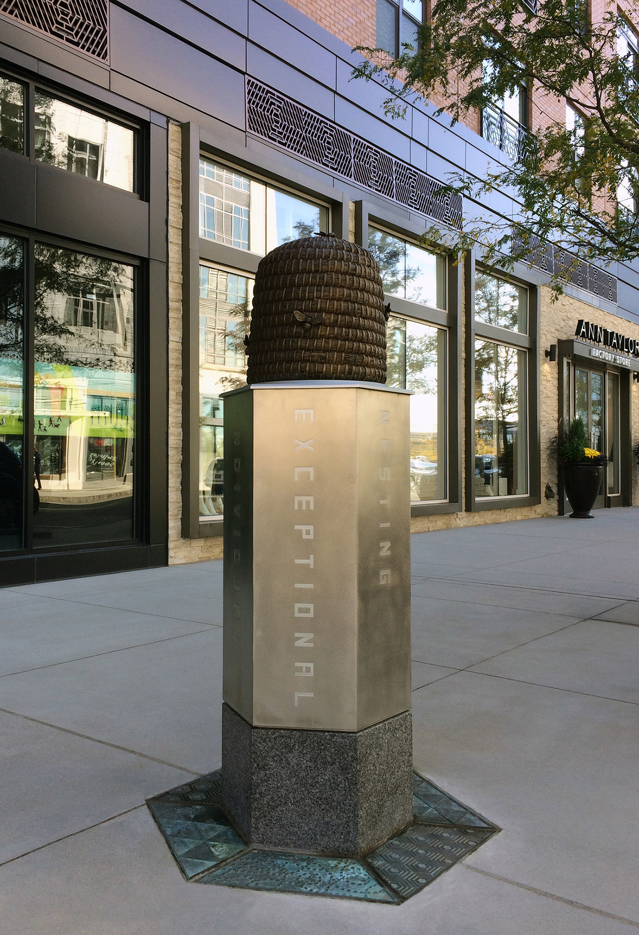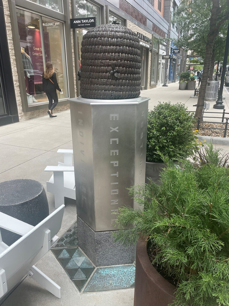 Custom “Bee Skep”, cast bronze with patina finish. Created through process of investment casting/direct burn out. DESIGNER: Foreseer, Seattle, WA. PROJECT: Assembly Row. LOCATION: Sommerville, MA.