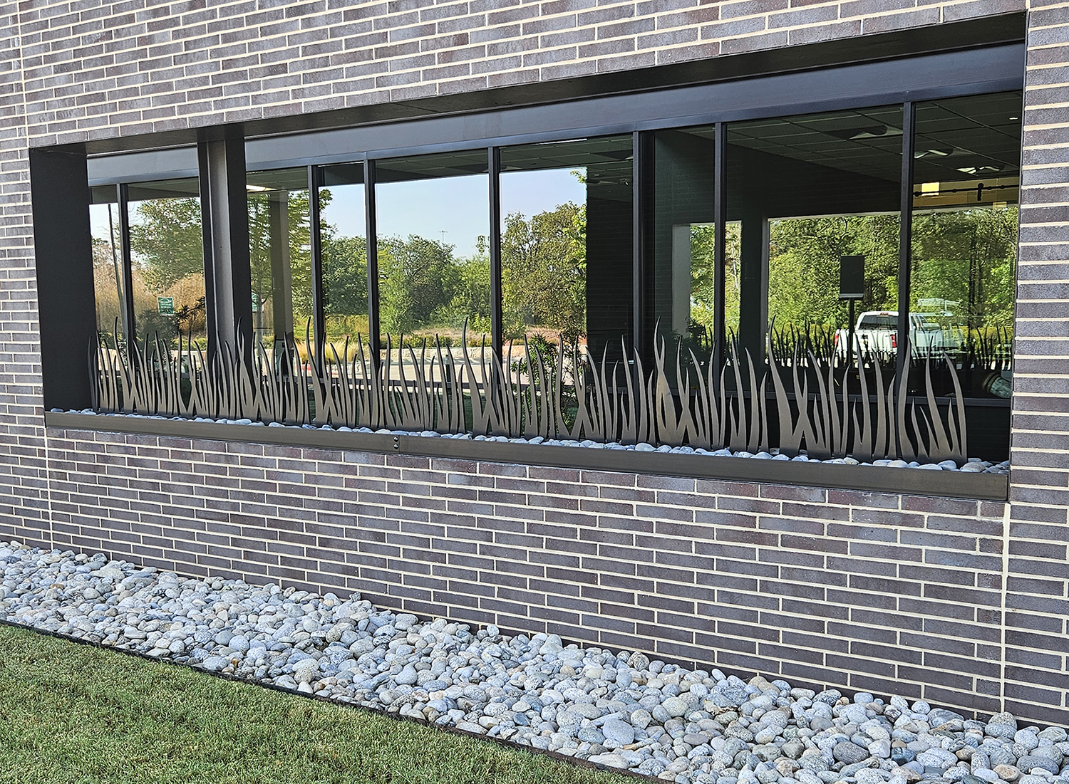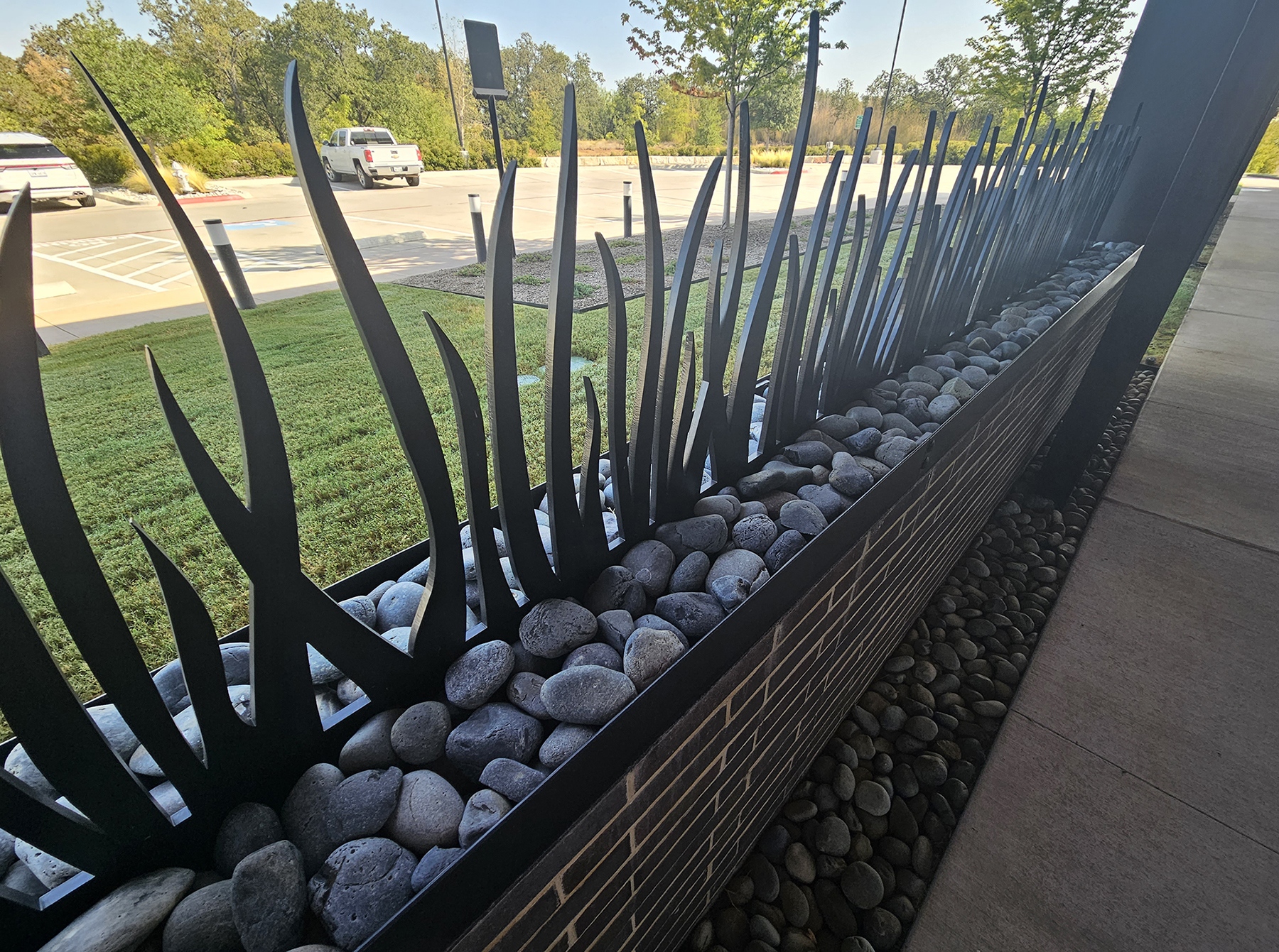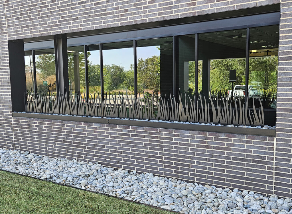 Laser cut “grass” panels made from 1/2″ corten steel. Powder coat finish. DESIGN: Bob Moore Construction. PROJECT: BMC Corporate Headquarters. LOCATION: Grapevine, TX.