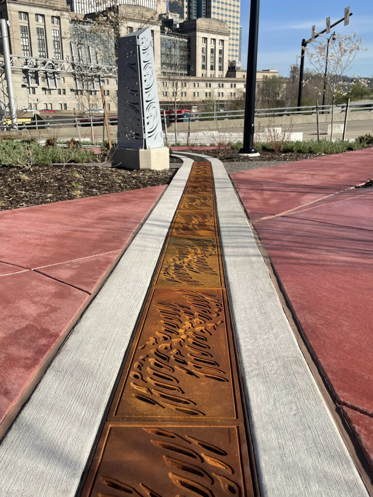 Custom 12″ wide radius trench grates with ‘braid’ pattern to match other elements of the project design. Raw cast ductile iron. DESIGN: LBA Landscape Architecture. PROJECT: Frankie Pace Park. LOCATION: Pittsburgh, PA.