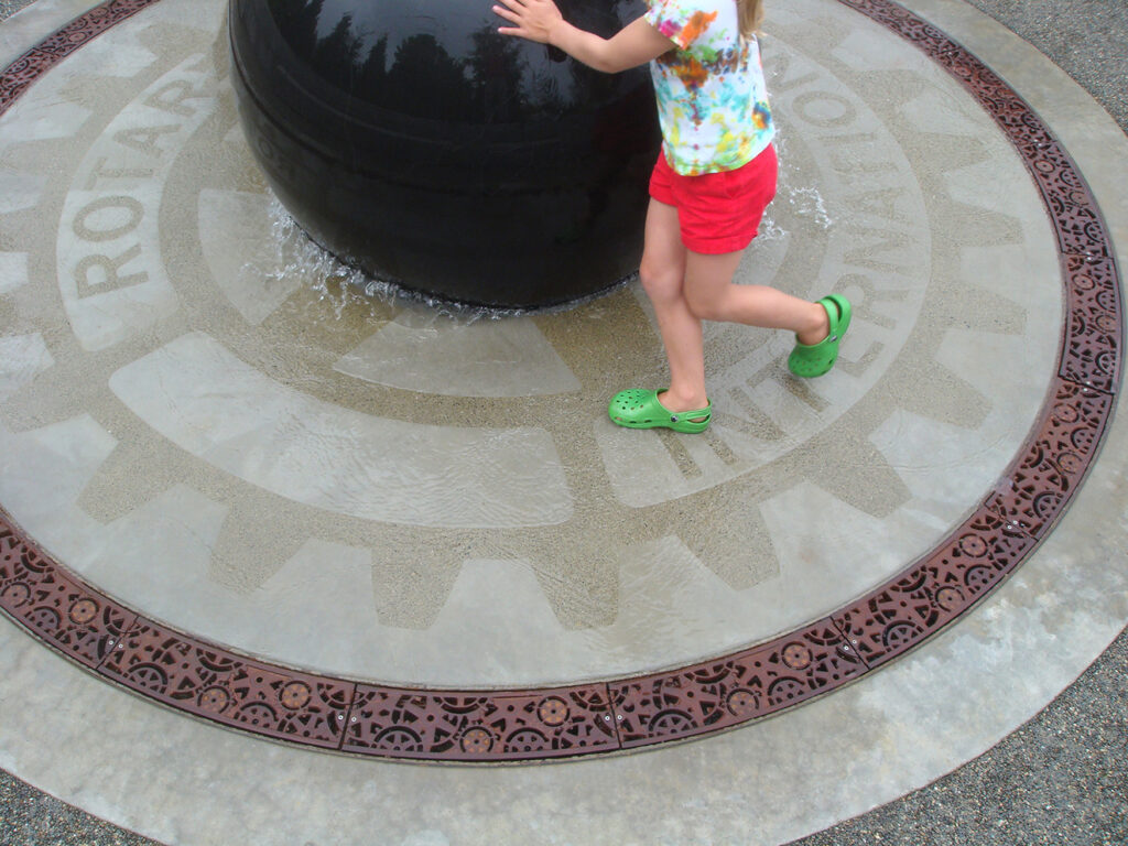 Custom “Rotary” radius trench grates with a design that later became our Dynamo pattern. Raw cast ductile iron. DESIGN: Richard VanDeMark Landscape Architect (funded by Bellevue Breakfast Rotary Club). PROJECT: Crossroads Water Spray Playground. LOCATION: Bellevue, WA.