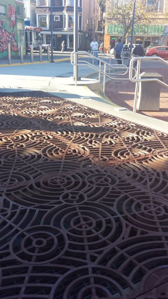 12′ x 12′ grate array consisting of custom Oblio 24″ x 24″ vent covers; raw cast iron. PROJECT: Mission St. BART Station. LOCATION: San Francisco, CA.