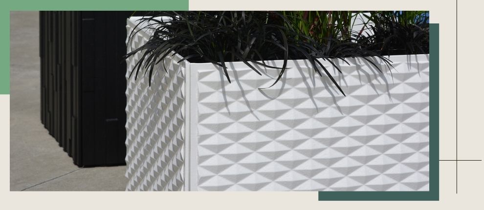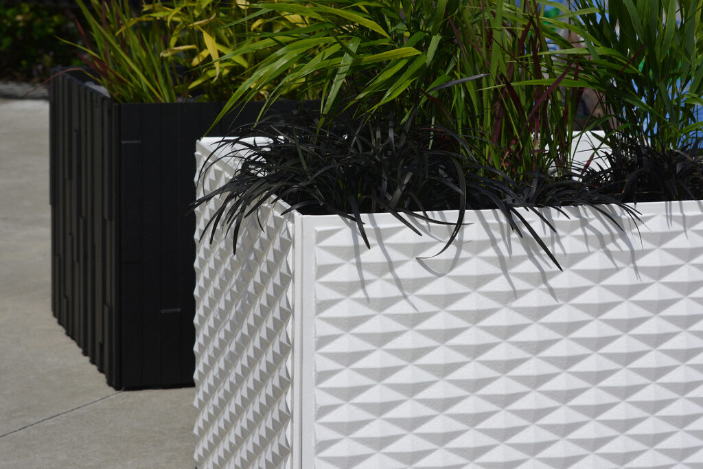 Modular Planter Box system shown with Peak panels. Cast iron with powder coat finish.