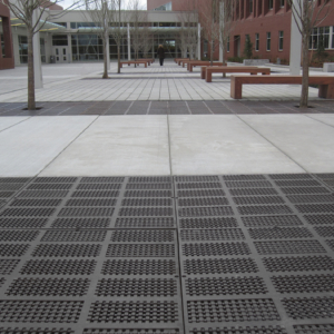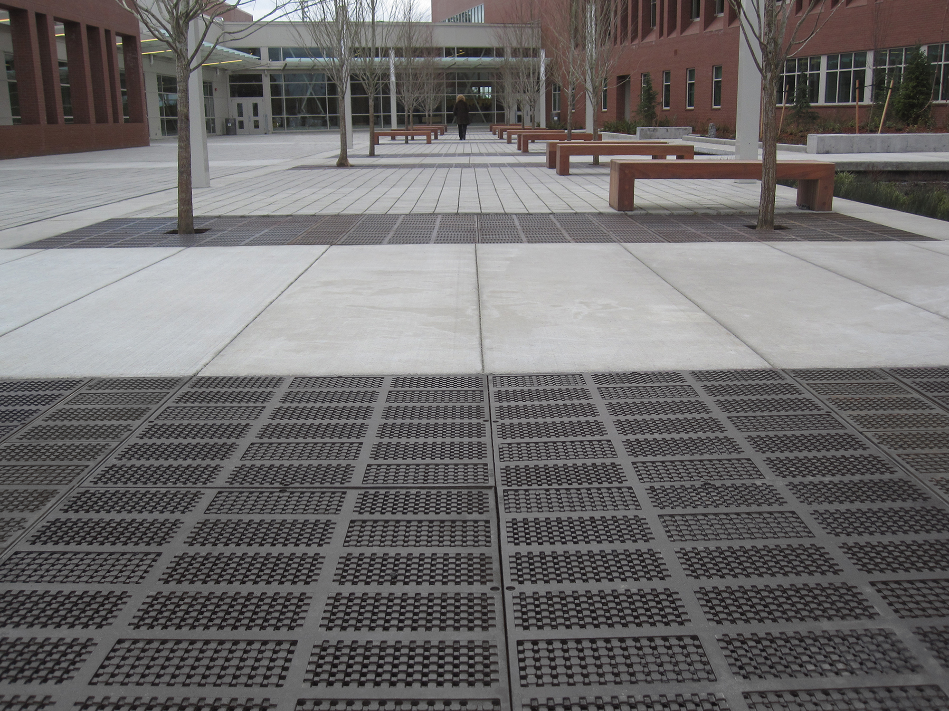 Explora 36″ sq. grate panels, cast iron with baked-on-oil finish. Panels were cut and arrayed to form large tree grates. PROJECT: Bellevue High School. LOCATION: Bellevue, WA.