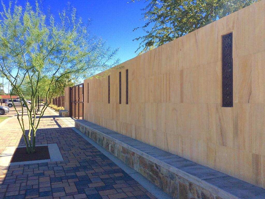Janis trench grates flush mounted and used as sconces. Installed with Janis tree grates, both in cast iron. PROJECT: All Saints School. LOCATION: Phoenix, AZ.