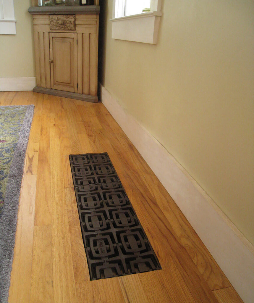 Carbochon 8″ x 20″ cast iron trench grate repurposed as register cover. Water jet cut to fit existing opening in floor.