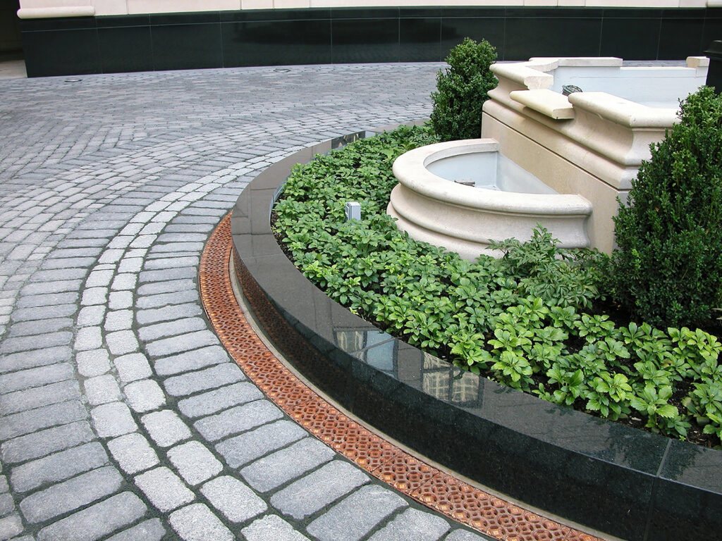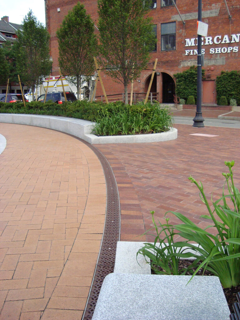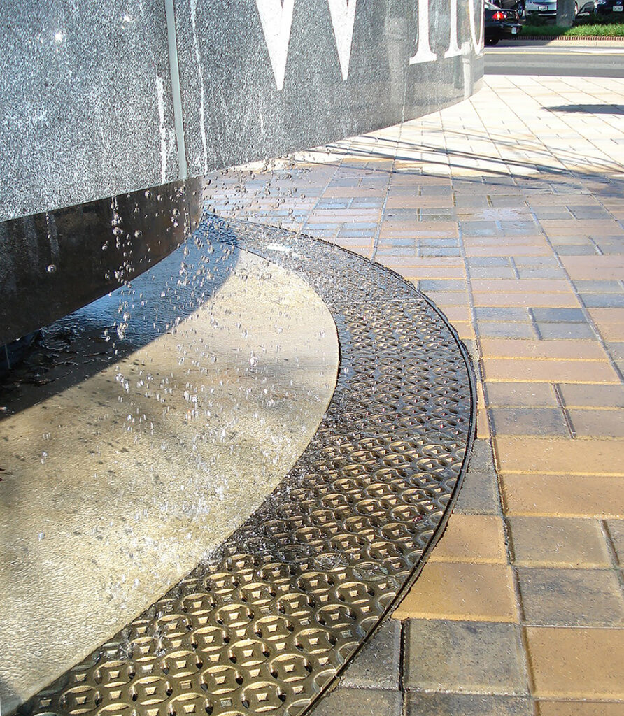 Interlaken 11″ wide radiused trench grate, raw cast bronze. DESIGN: Lardner/Klein Landscape Architects. PROJECT: Vienna Town Green. LOCATION: Vienna, VA.