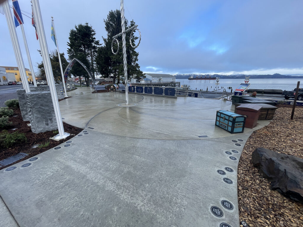 Interlaken 5″ wide heel-proof radius trench grate, raw cast aluminum. DESIGN: The West Studio. INSTALLATION: Rickenbach Construction, Inc. PROJECT: Astoria Nordic Heritage Park. LOCATION: Astoria, OR.