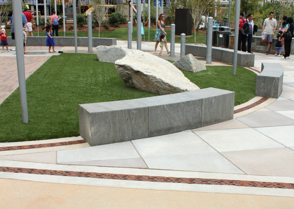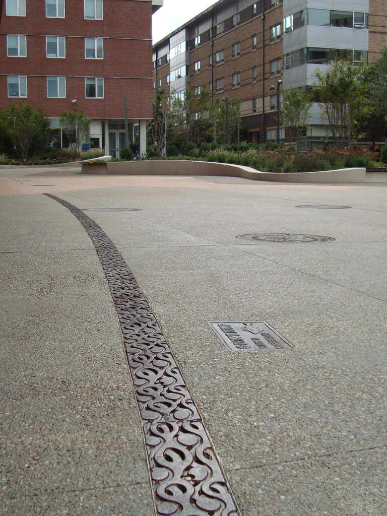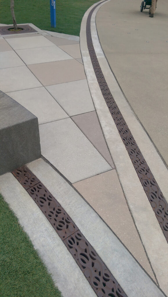 Janis 5″ wide radius trench grate, raw cast iron. DESIGN: LandDesign. PROJECT: Romare Bearden Park. LOCATION: Charlotte, NC.
