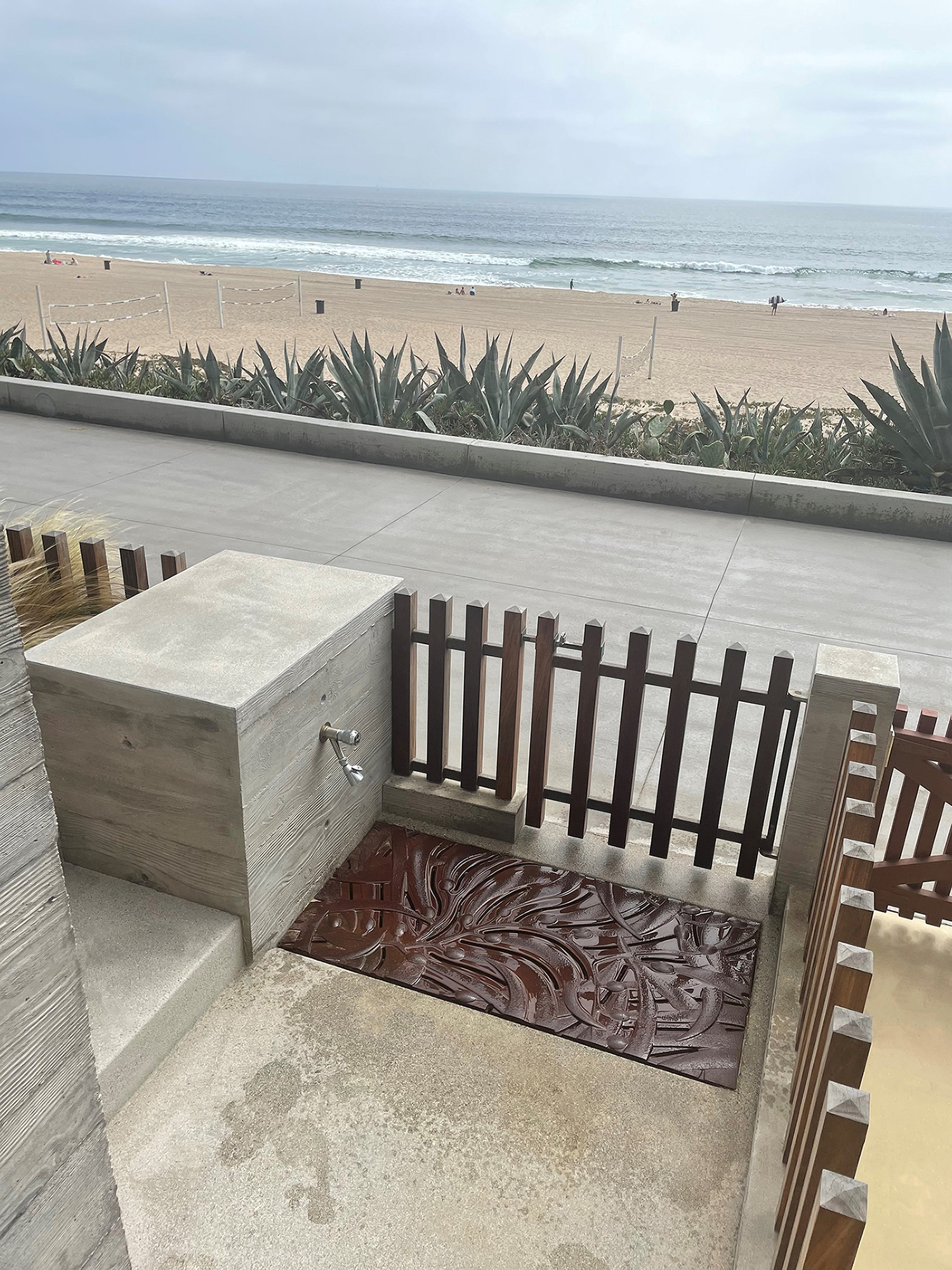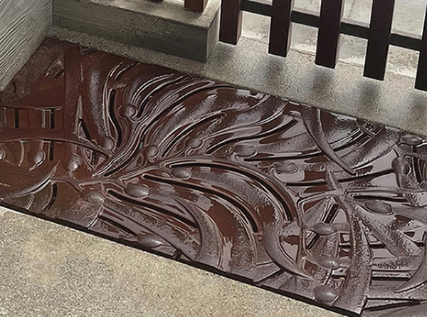 Kelp 24″ x 48″ grate, cast iron with baked-on-oil finish. Installed at the base of a beachfront residence foot bath.
