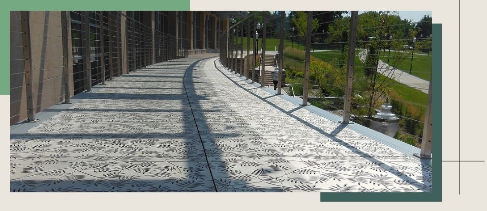 Locust 20″ x 40″ heel-proof grate, cast iron with baked-on-oil finish. Shown arrayed as pedestrian bridge deck. DESIGN: Hord Coplan Macht. PROJECT: Loyola University Baltimore Campus. LOCATION: Baltimore, MD.Â