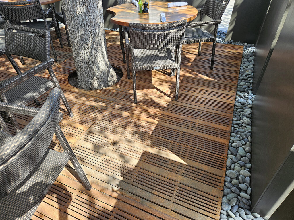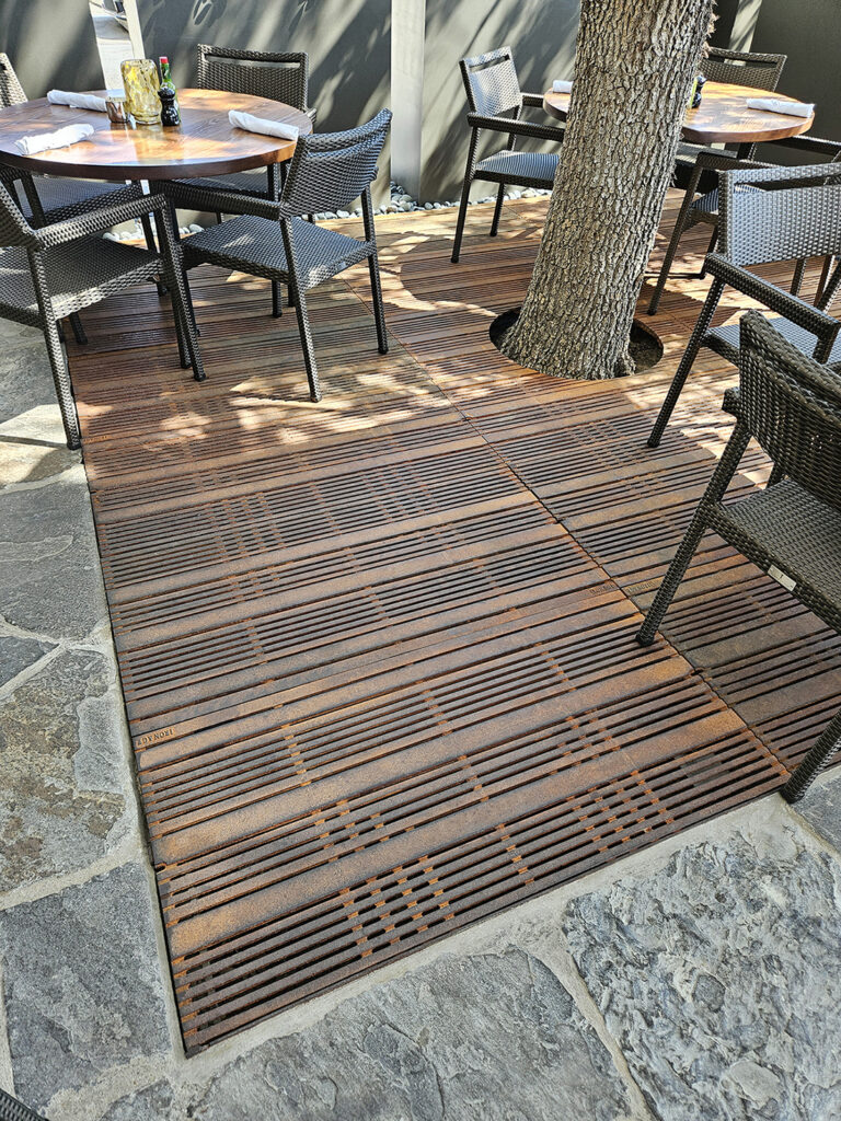 Madras 24″ x 48″ heel-proof grate panels in raw cast ductile iron, used to create a 12′ tree grate array. DESIGN: Michael Hsu Office of Architecture. PROJECT: Bobbie’s Airway Grill. LOCATION: Dallas, TX