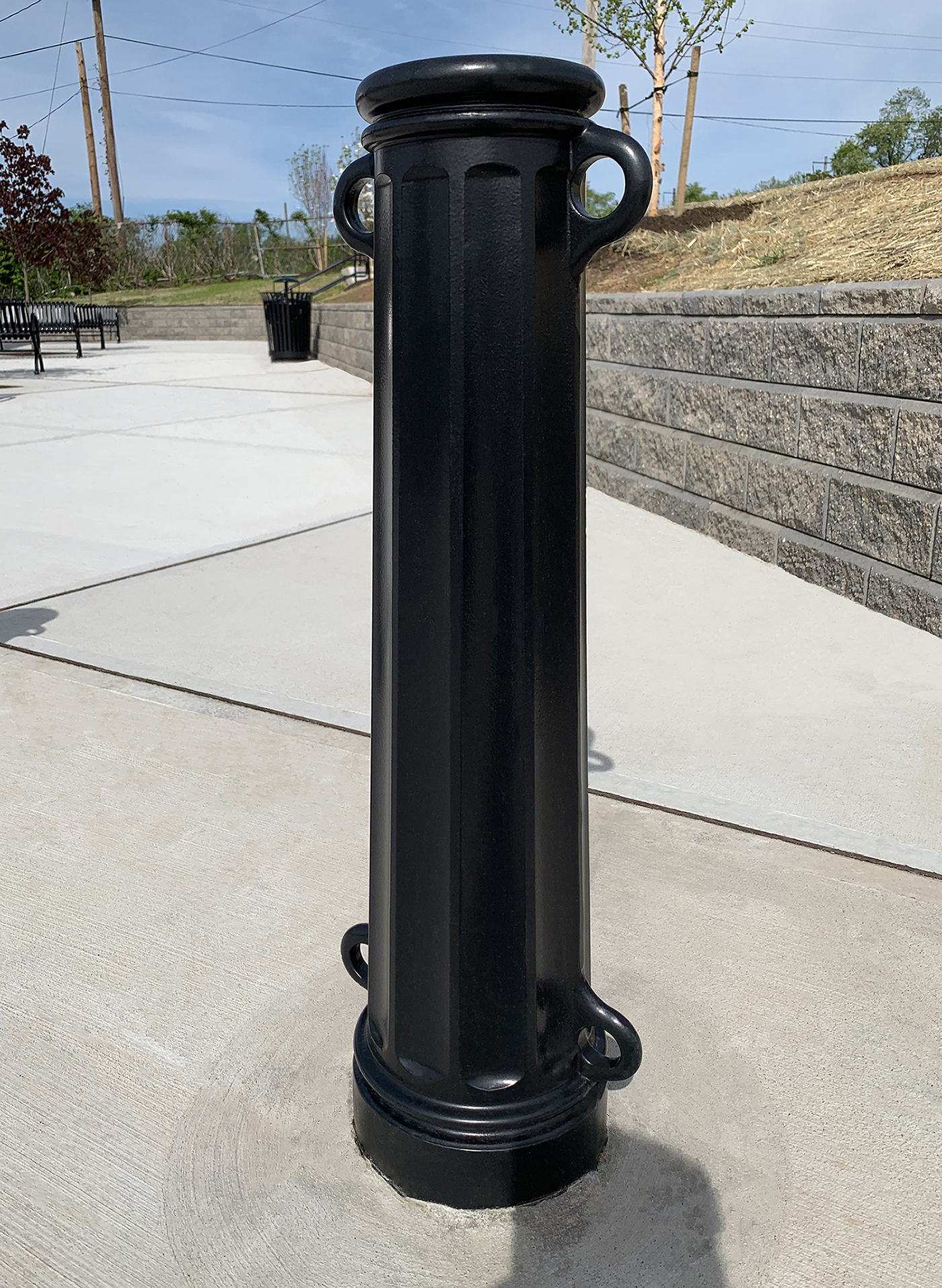 Main Street bollard, cast aluminum with black powder coat finish. DESIGN: French & Parrello Associates. INSTALLER: The Earle Companies. PROJECT: Hetzel Field Pool Parking Lot. LOCATION: Trenton, NJ.