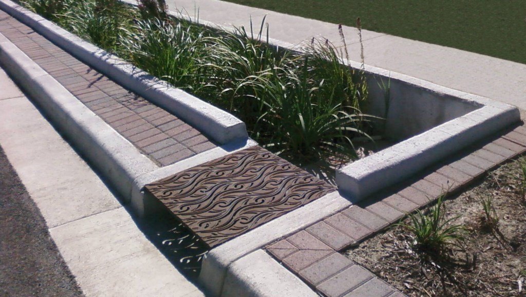 Minnione 26″ x 36″ grate, raw cast iron. Shown arrayed as rain garden/bioswale inlet.
