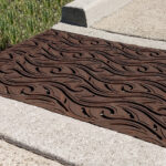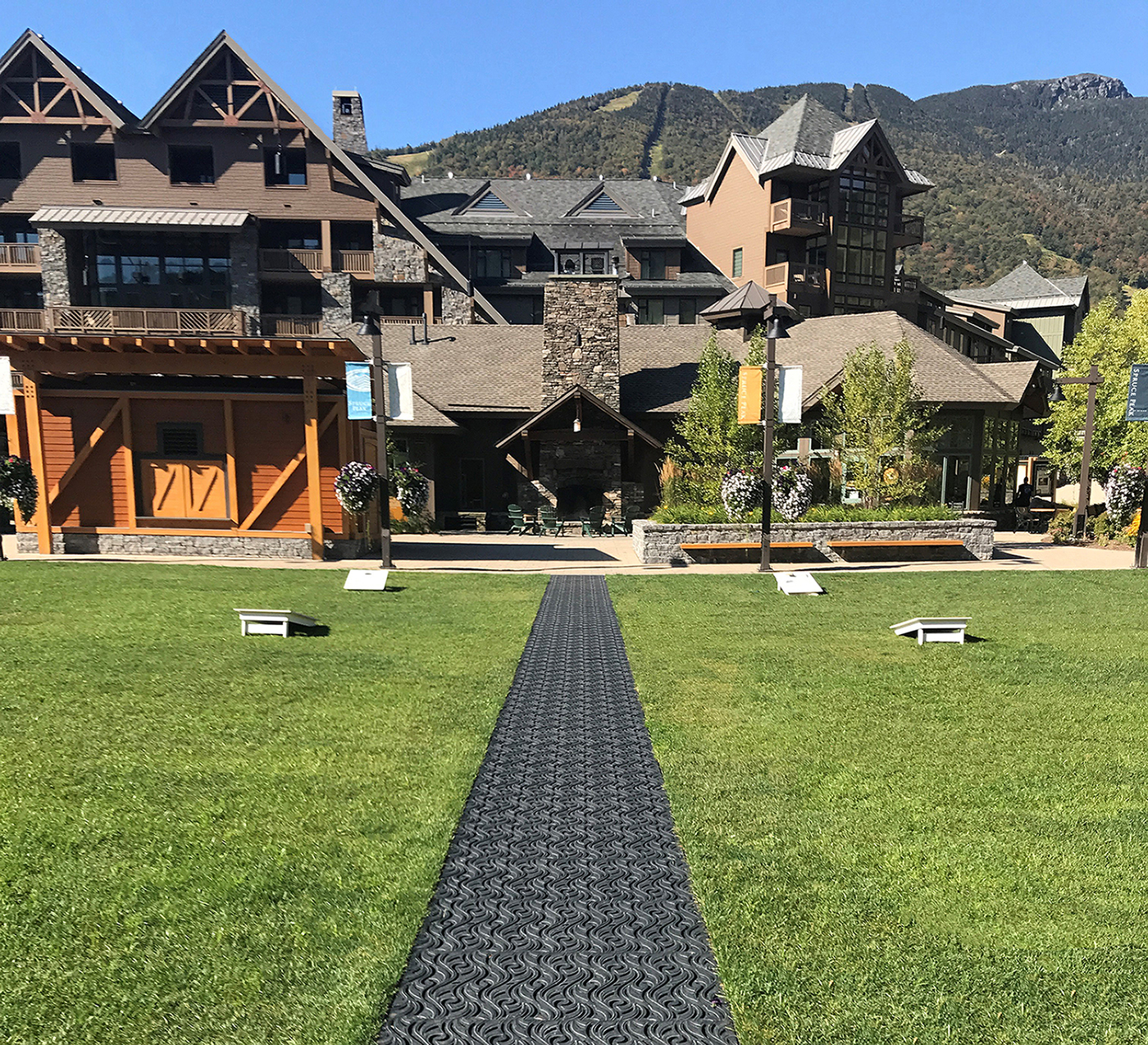 Minnione 24″ x 44″ heavy-duty trench grate, cast iron with powder coat finish. DESIGN: SE Group. PROJECT: Stowe Mountain Lodge & Spa. LOCATION: Stowe, VT. PHOTO CREDIT/INSTALLER: Josh Goldstein, Stonewall Hardscapes.