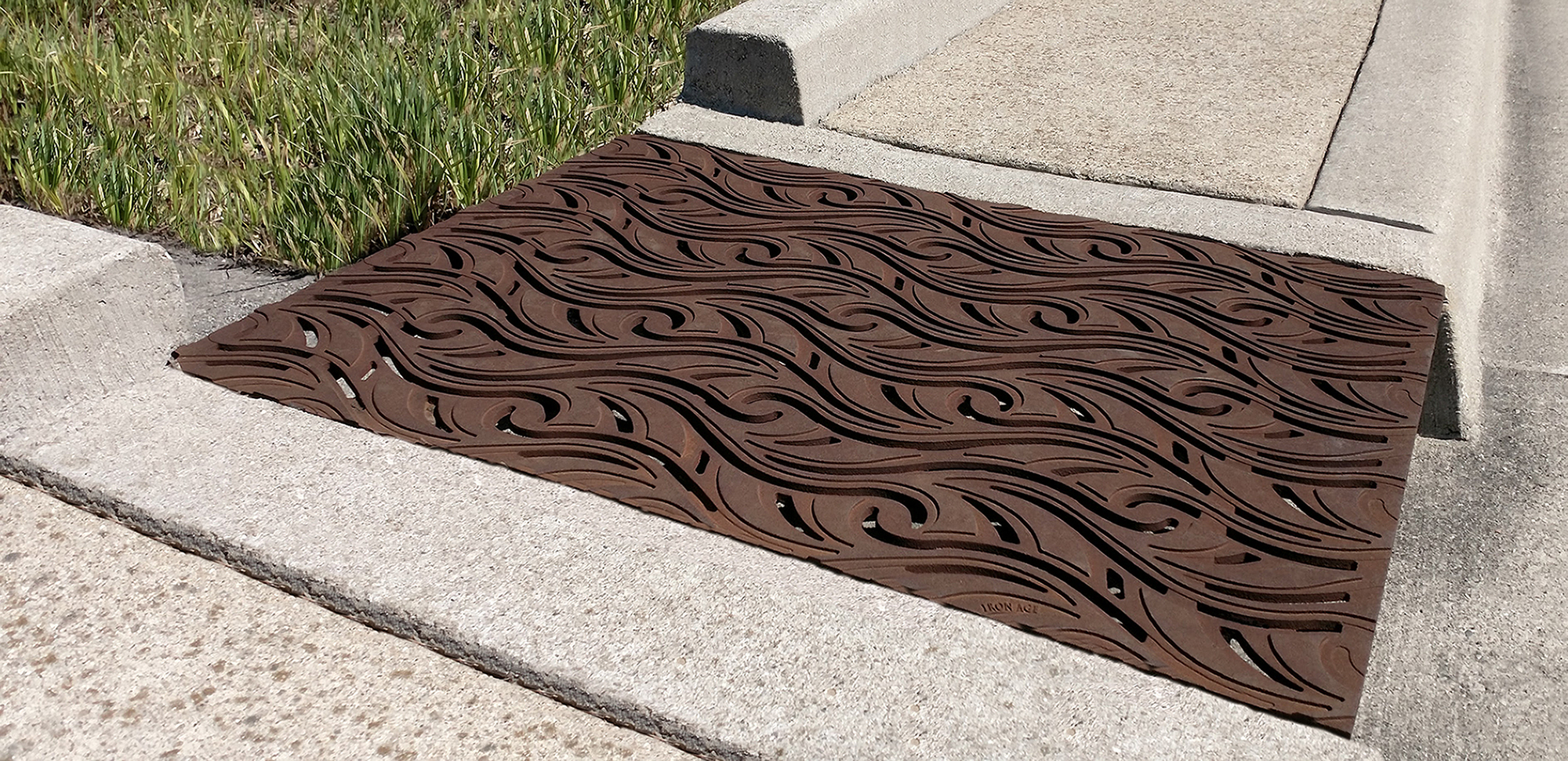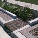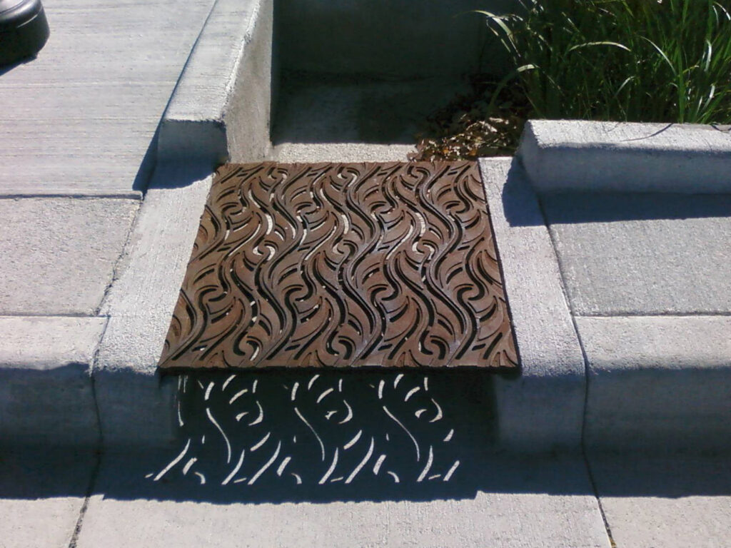 Minnione 26″ x 28″ trench grate, cast iron with baked-on-oil finish, used in a stormwater retention, rain garden project in Lawrence Village, IN.