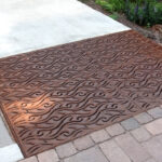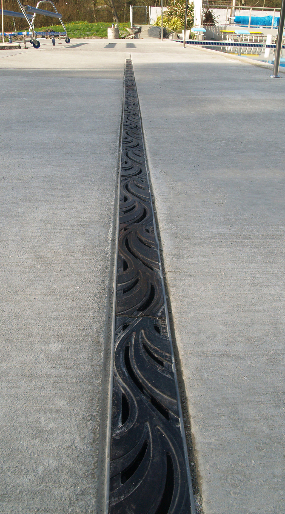 Minnione 3″ x 12″ trench grate, raw cast bronze. PROJECT: Normandy Park Swim Club. LOCATION: Normandy Park, WA.