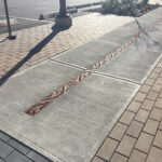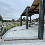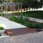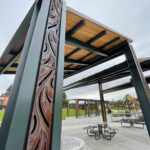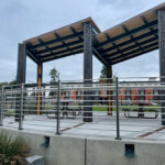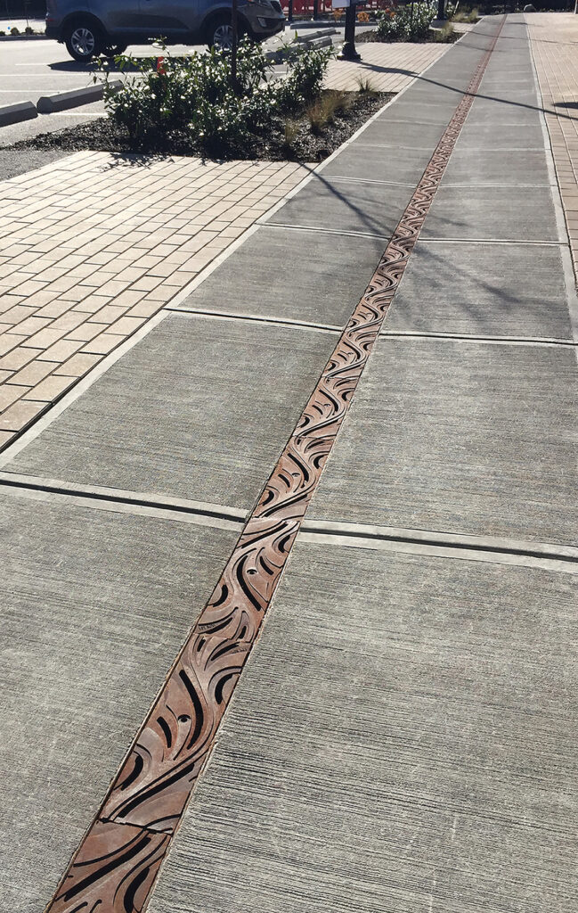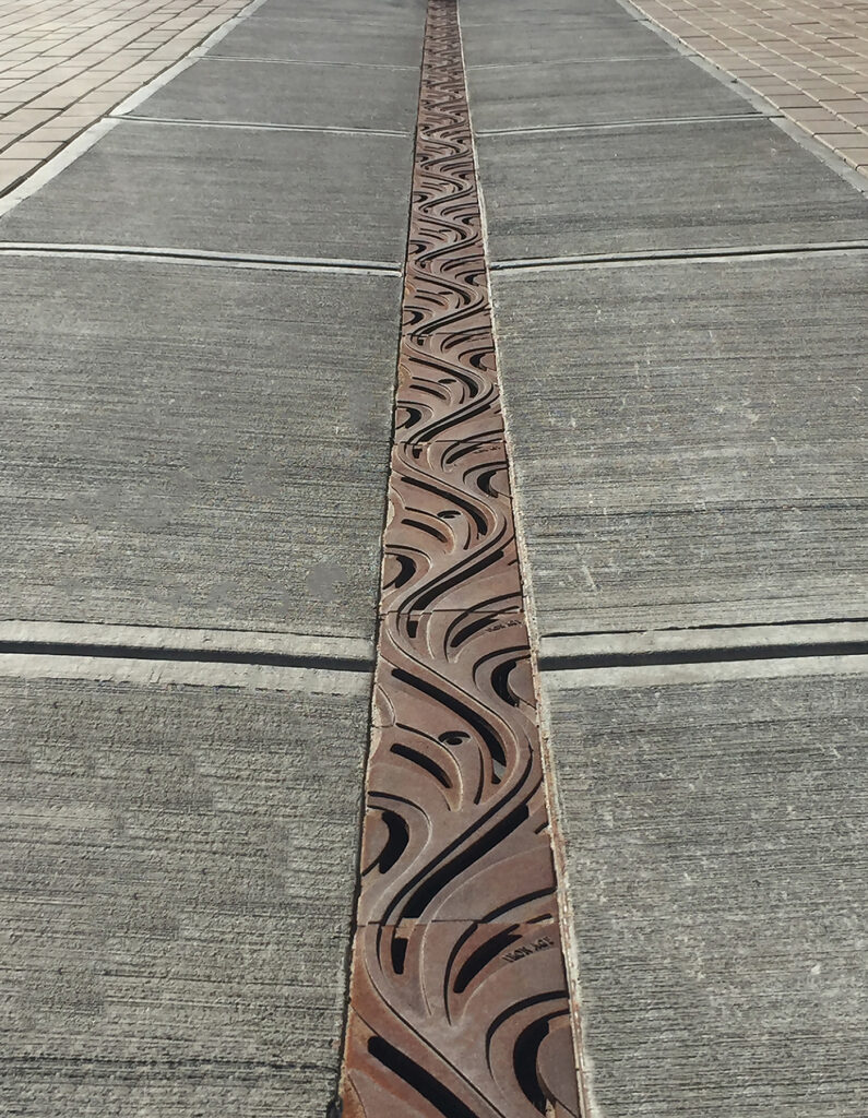 Minnione 5″ x 20″ trench grates, cast ductile iron with baked-on-oil finish. Grates are installed in the vertical plane, covering pergola downspouts. The downspouts drain into trench channels in the ground plane, also covered with our Minnione grates. DESIGN: HBB Landscape Architecture. PROJECT: Sunset Neighborhood Park. LOCATION: Renton, WA.
