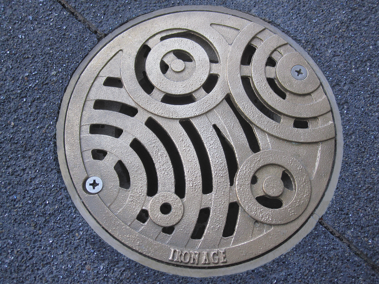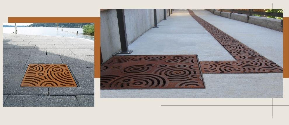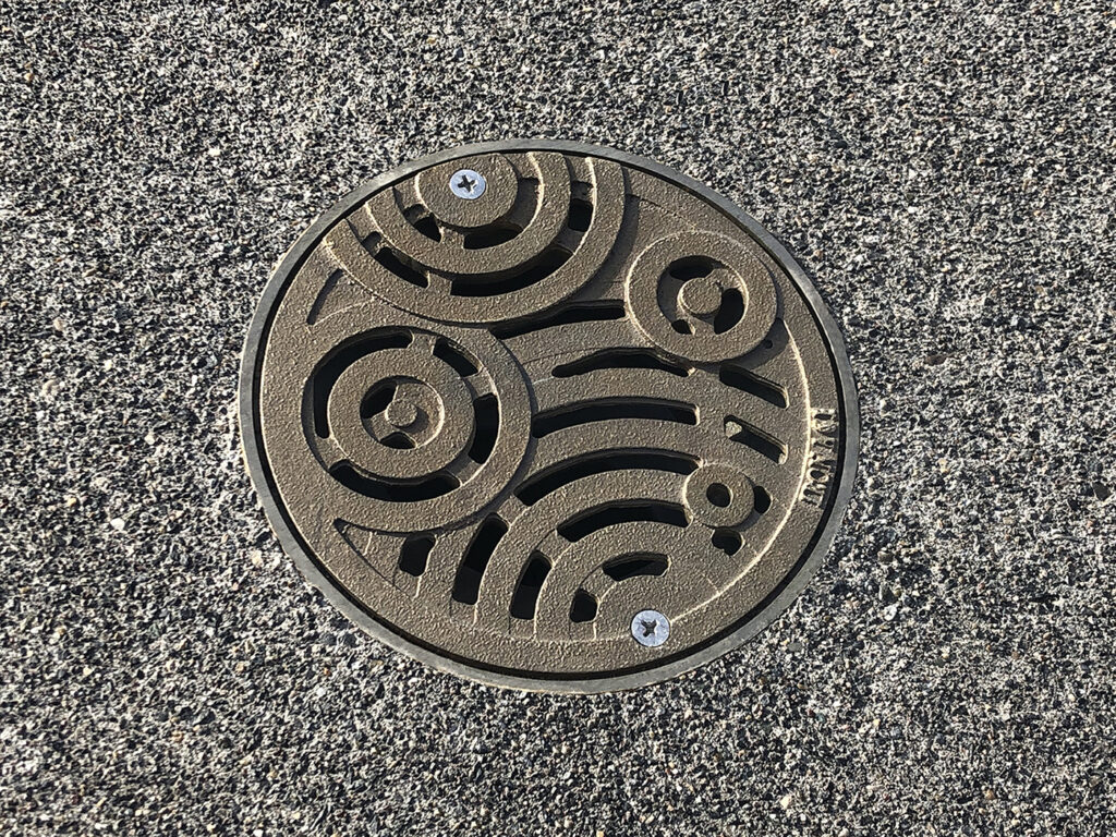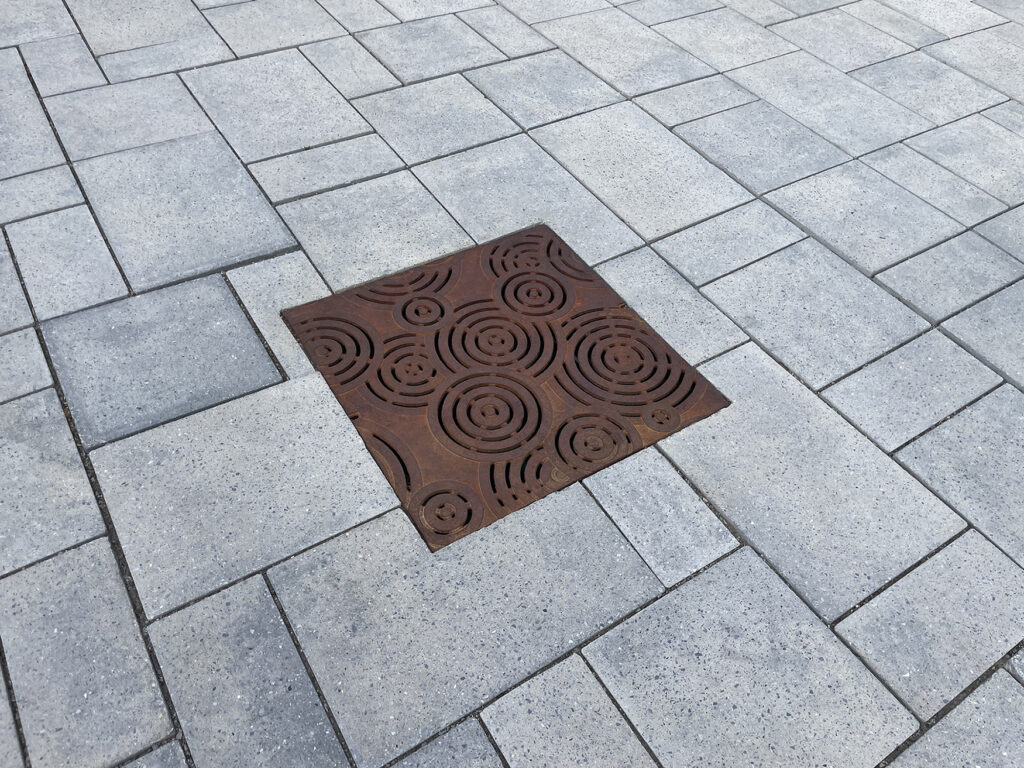 Oblio 12″ x 12″ heel-proof catch basin grate, raw cast iron. DESIGN: GGLO. PROJECT: Burien Town Center. LOCATION: Burien WA.