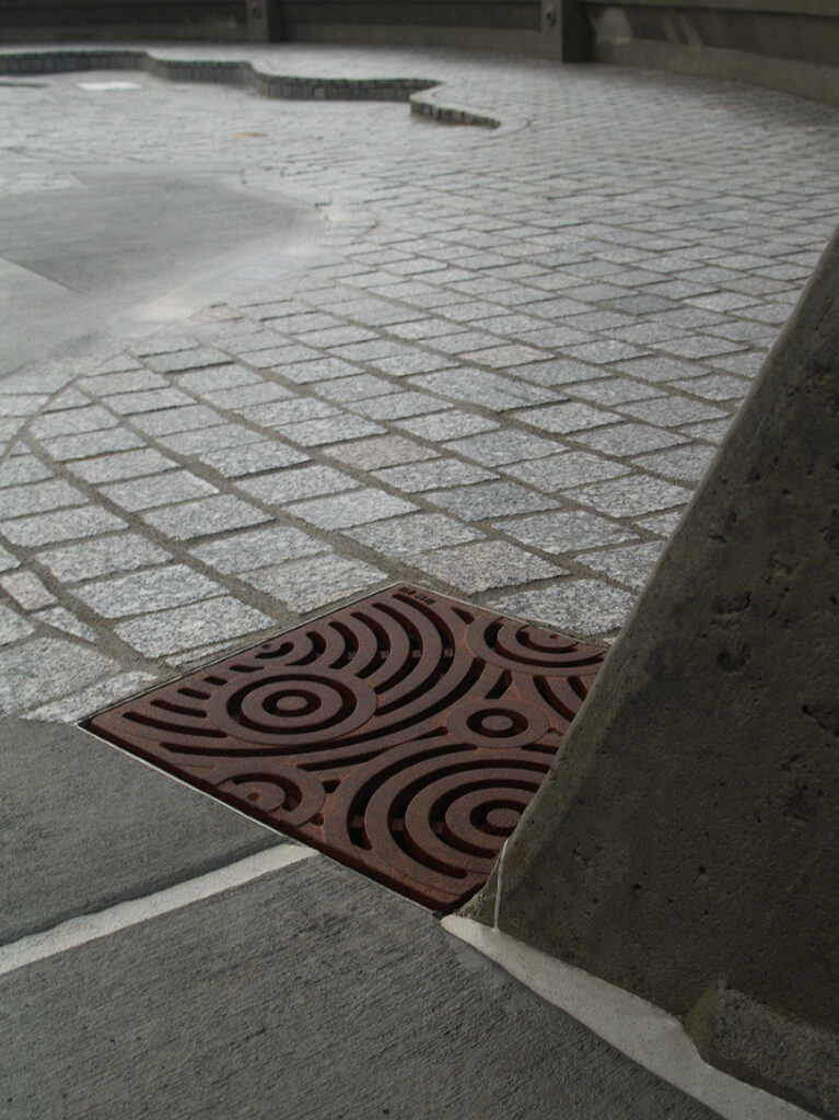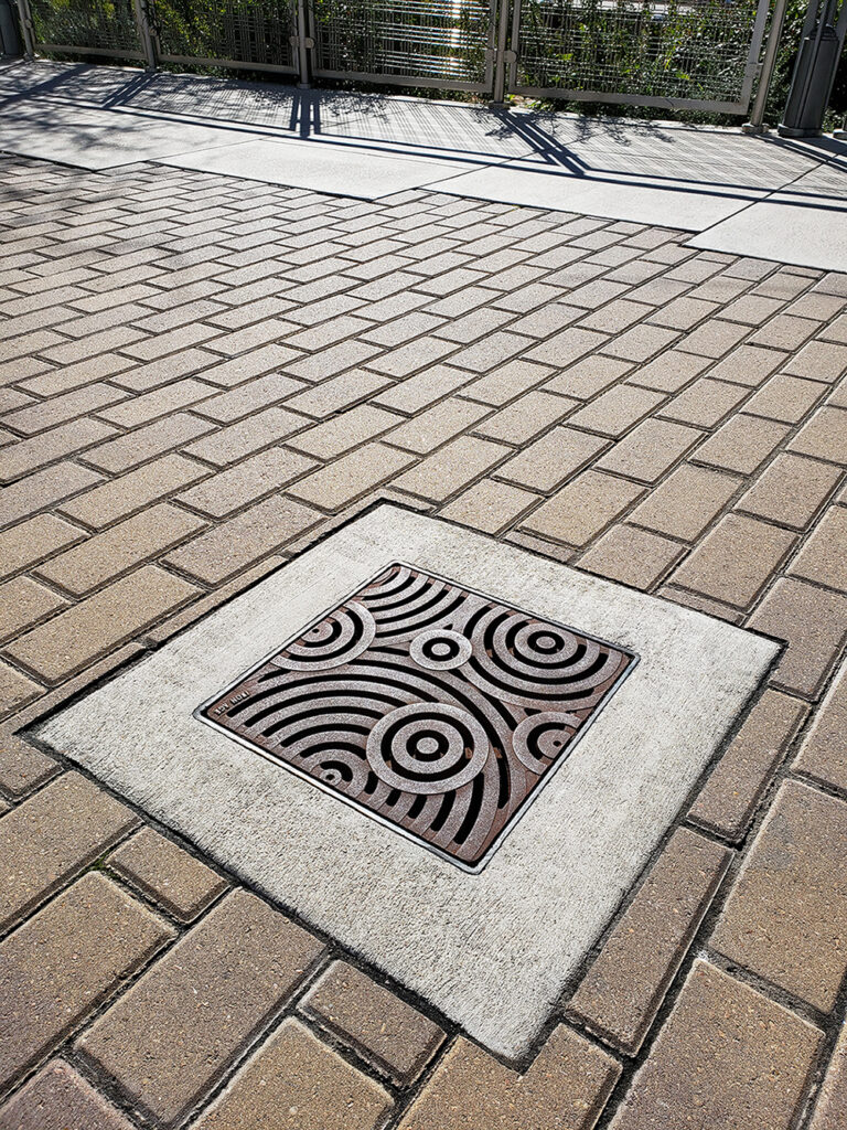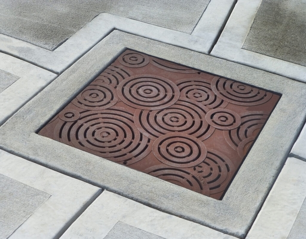 Oblio 12″ x 12″ heel-proof catch basin grate, raw cast ductile iron. DESIGN: Coleman & Associates. PROJECT: Austin Central Library. LOCATION: Austin, TX.