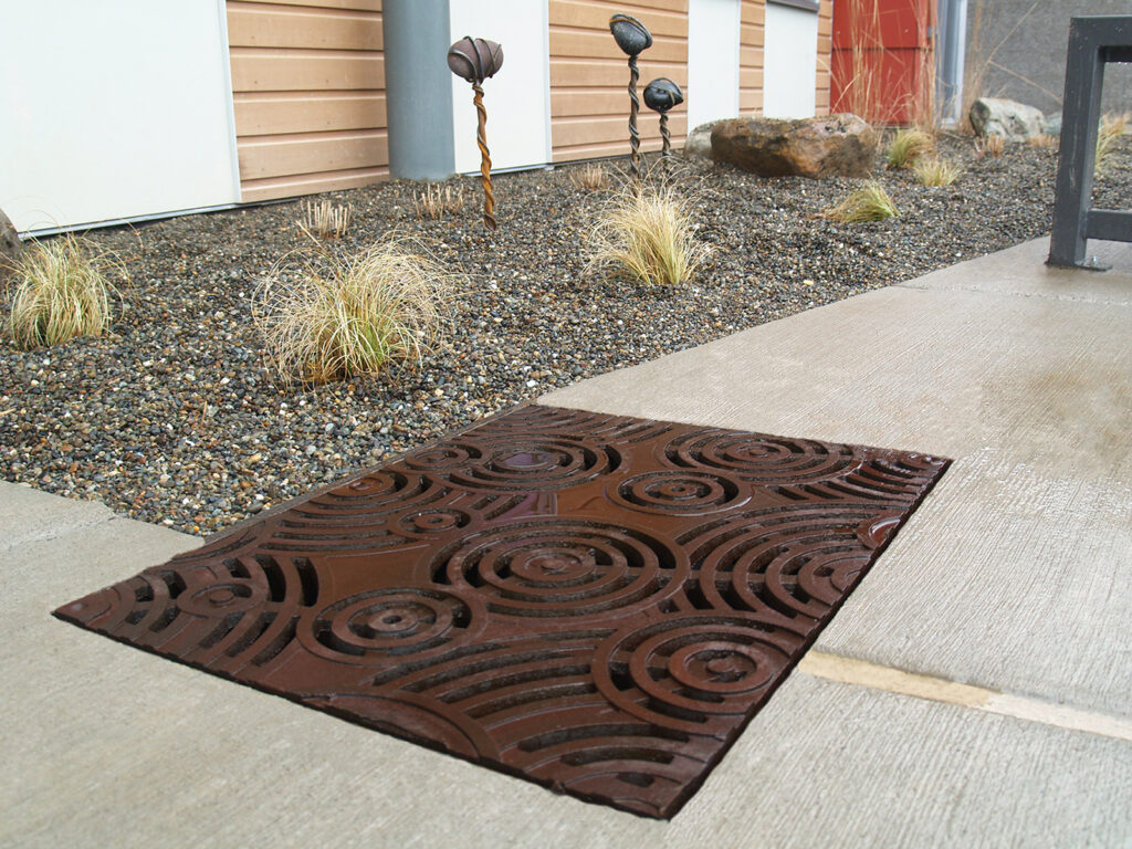 Oblio 18″ x 24″ (WSDOT ‘Type 1’) catch basin grate, raw cast iron. DESIGN: Miller Hayashi Architects. PROJECT: Greenbridge Early Learning Center. LOCATION: Seattle WA.