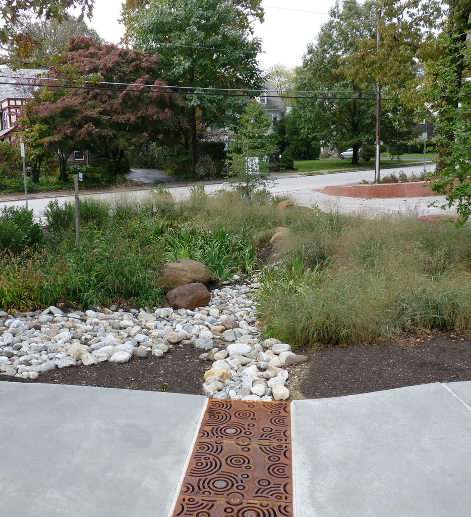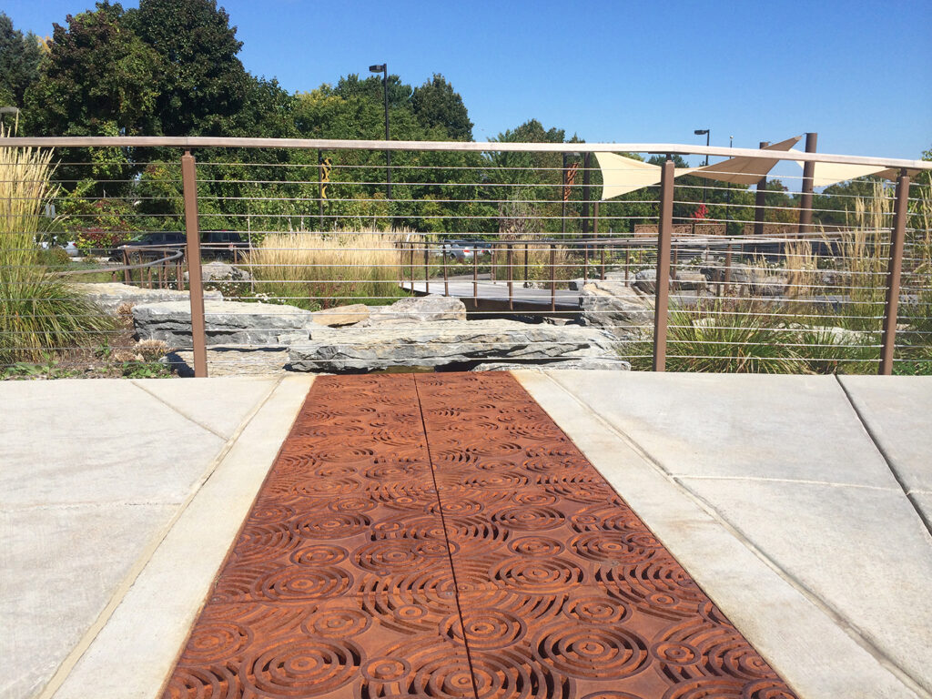 Oblio 18″ x 24″ catch basin grates, raw cast iron. Arrayed as trench/bioswale inlet grates. DESIGN: EDR. PROJECT: Rosamond Gifford Zoo South Entrance. LOCATION: Syracuse, NY.
