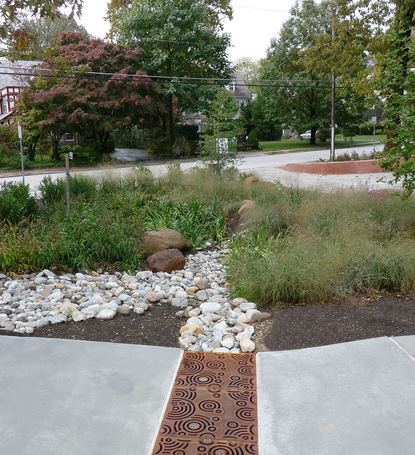 Oblio 12″ x 12″ heel-proof catch basin grate, cast iron with baked-on-oil finish. DESIGN: SiteWorkshop Landscape Architecture. PROJECT: Wright Park. LOCATION: Tacoma, WA
