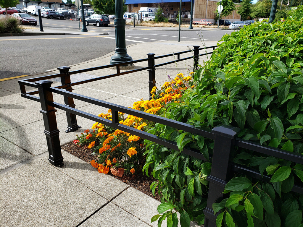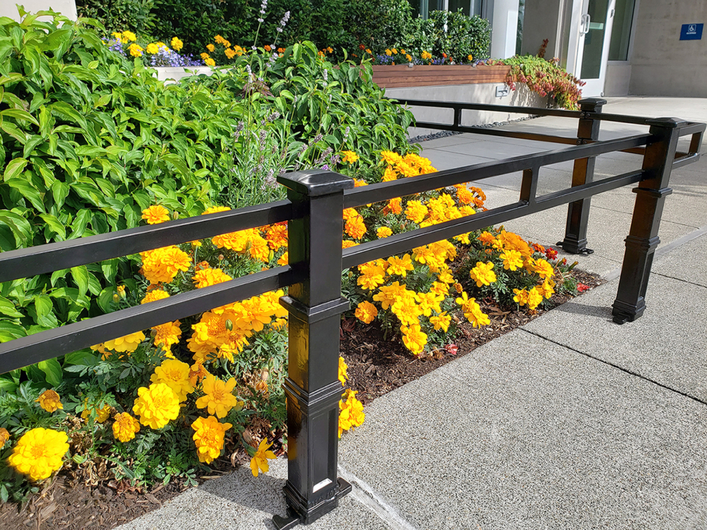 Newell planter fence, cast ductile iron posts and adjustable-length steel bar with black powder coat finish.