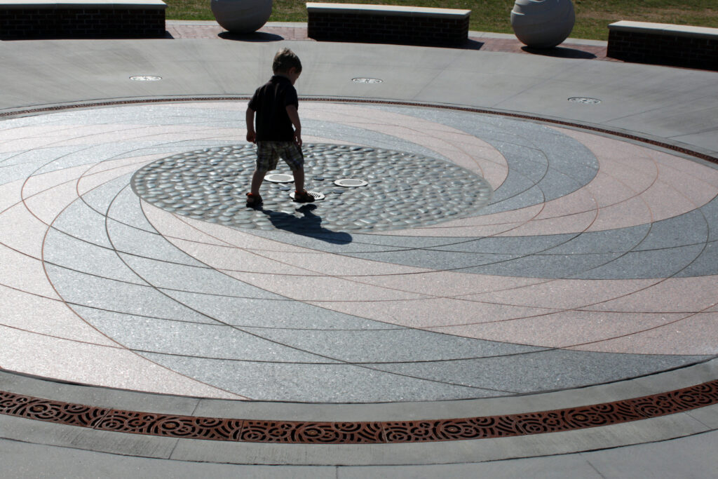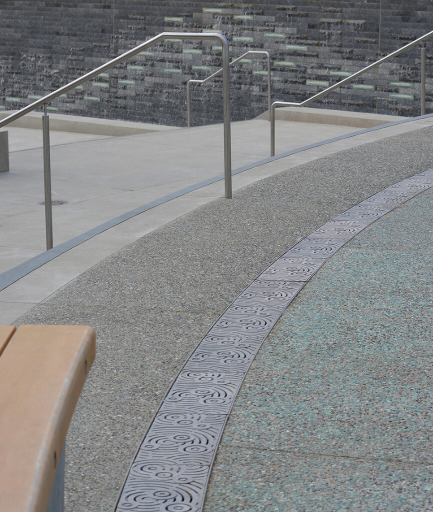 Granite arrival fountain with 5″ wide Oblio radius trench grates, cast ductile iron with e-coat + black powder coat finishes. DESIGN: TBG Partners. INSTALLER: Rotolo Consultants (RCI). PROJECT: Our Lady of the Lake Children’s Hospital. LOCATION: Baton Rouge, LA.