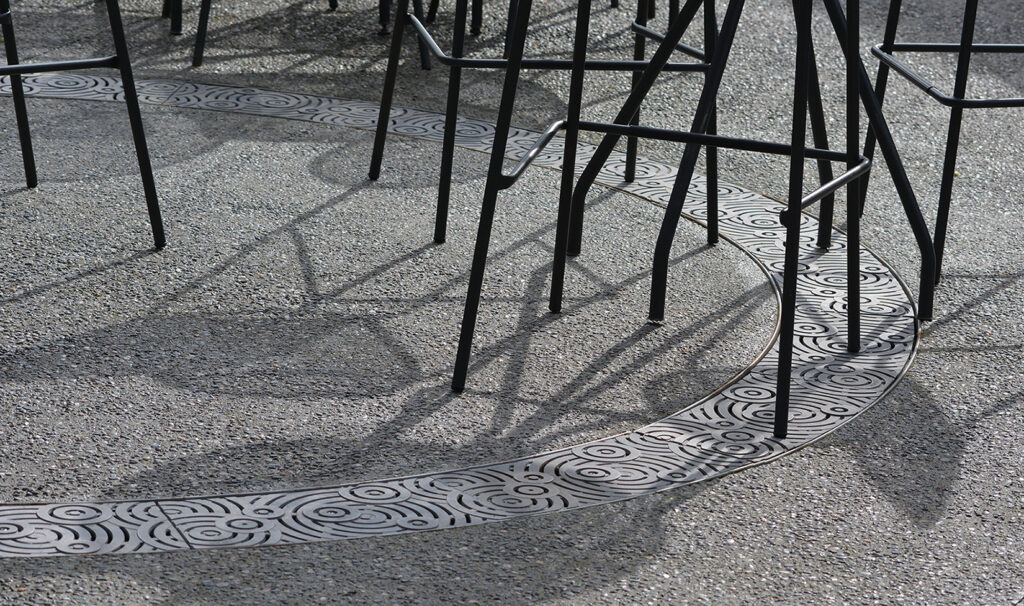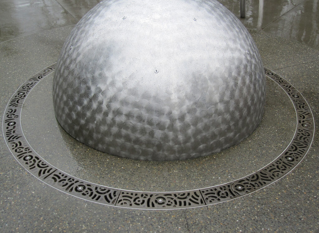 Oblio 9″ wide radius trench grate, raw cast aluminum. DESIGN: PWL Partnership. PROJECT: Vancouver Aquarium. LOCATION: Vancouver, BC, Canada.