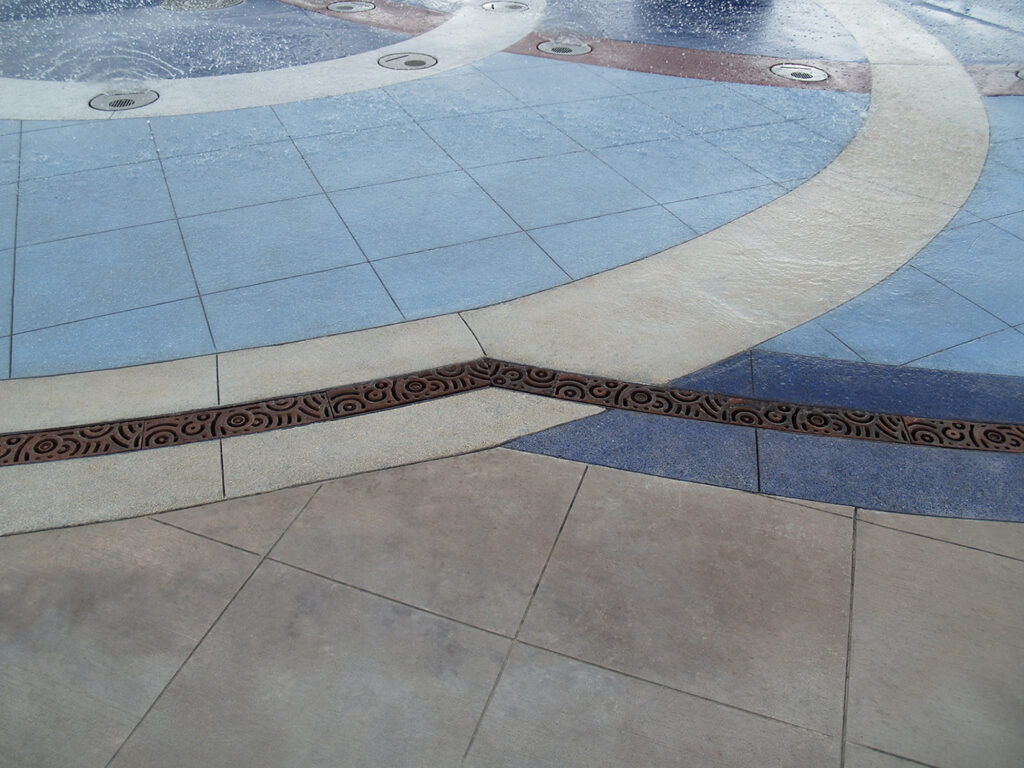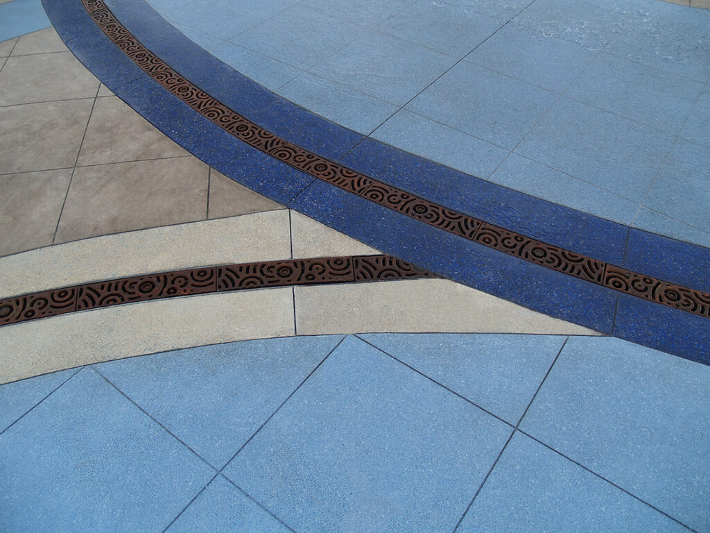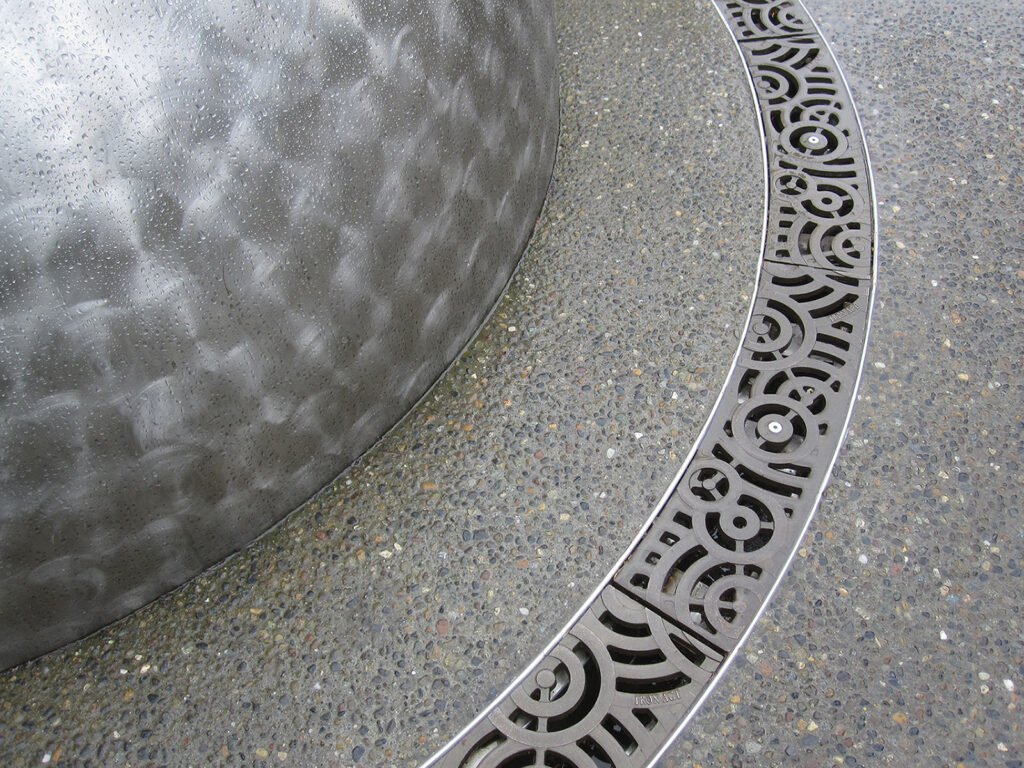 Oblio 5″ wide radius trench grate, raw cast iron. PROJECT: Stallings Fountain. LOCATION: Stallings, NC.