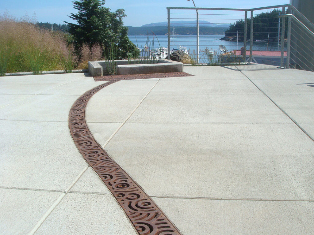 Oblio 5″ wide radiused trench grate, raw cast iron, arrayed with various radii. DESIGN: GGLO. PROJECT: 123 West. LOCATION: Friday Harbor, WA.